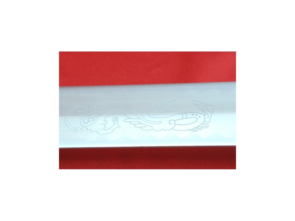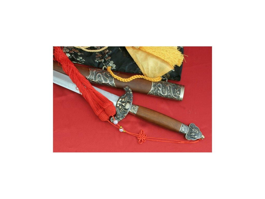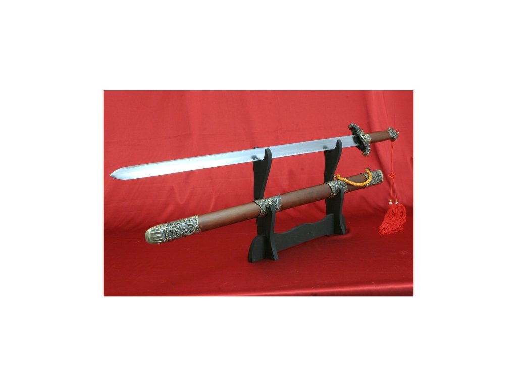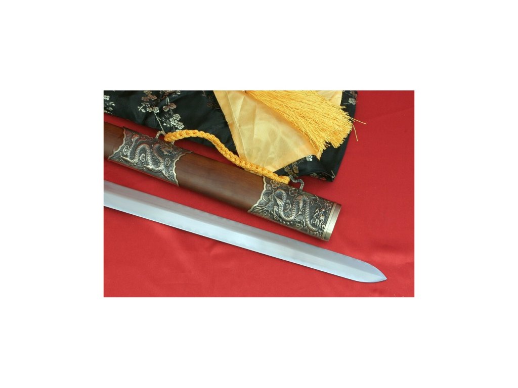 Kovaný čínský meč s leštěnou imitací kalení. Tupý (nebroušený) čínský meč najde své uplatnění jako dekorace, ale i k aktivnímu nácviku bojového umění. Rozhodně však není vhodný k sekání. Ocel není zakalena a proto má nízký stupeň tvrdosti. Sekání tvrdých materiálů by zanechalo nesmazatelné a hluboké stopy na ostří meče. .
