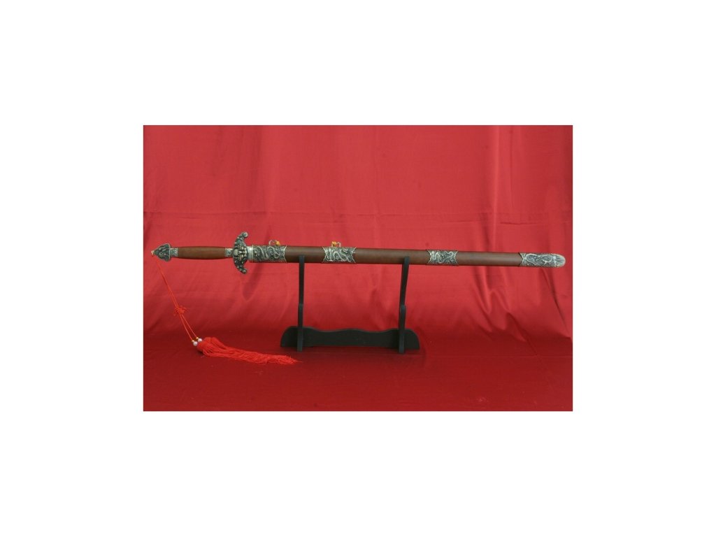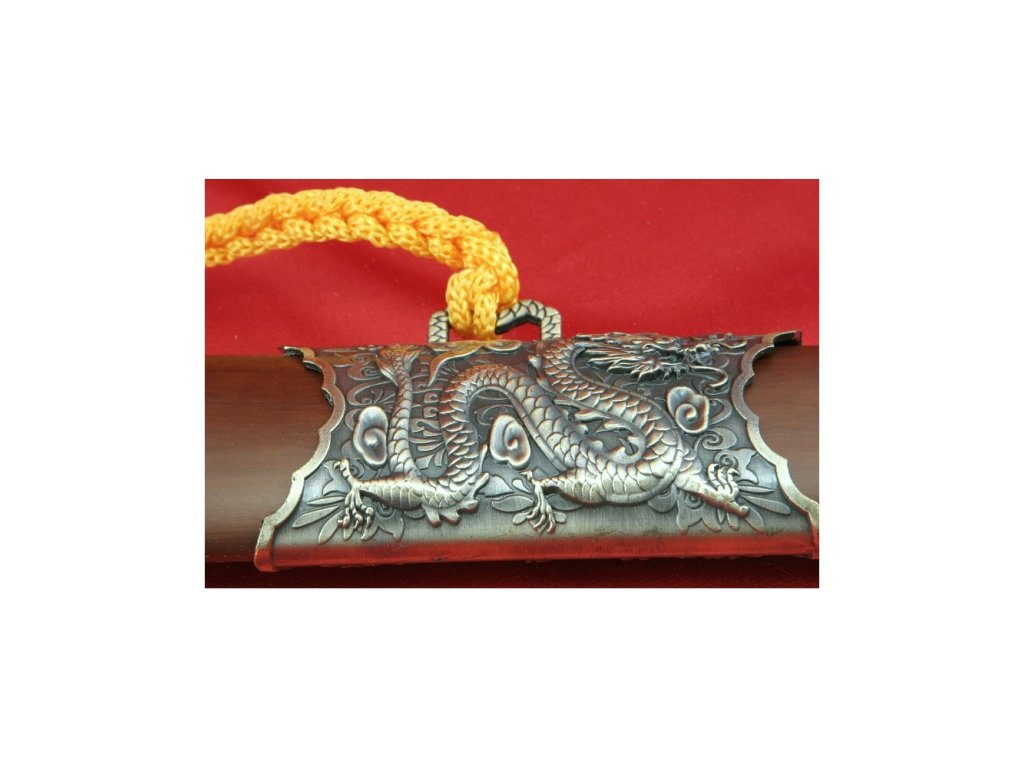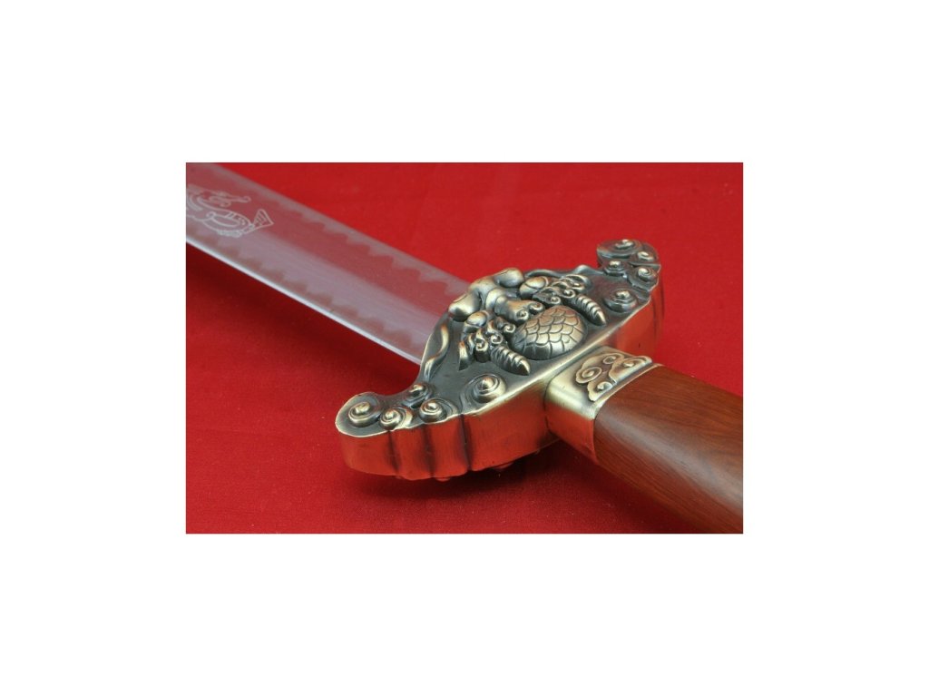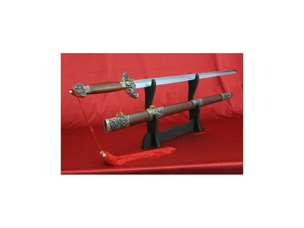 Kovaný čínský meč s leštěnou imitací kalení. Tupý (nebroušený) čínský meč najde své uplatnění jako dekorace, ale i k aktivnímu nácviku bojového umění. Rozhodně však není vhodný k sekání. Ocel není zakalena a proto má nízký stupeň tvrdosti. Sekání tvrdých materiálů by zanechalo nesmazatelné a hluboké stopy na ostří meče. .