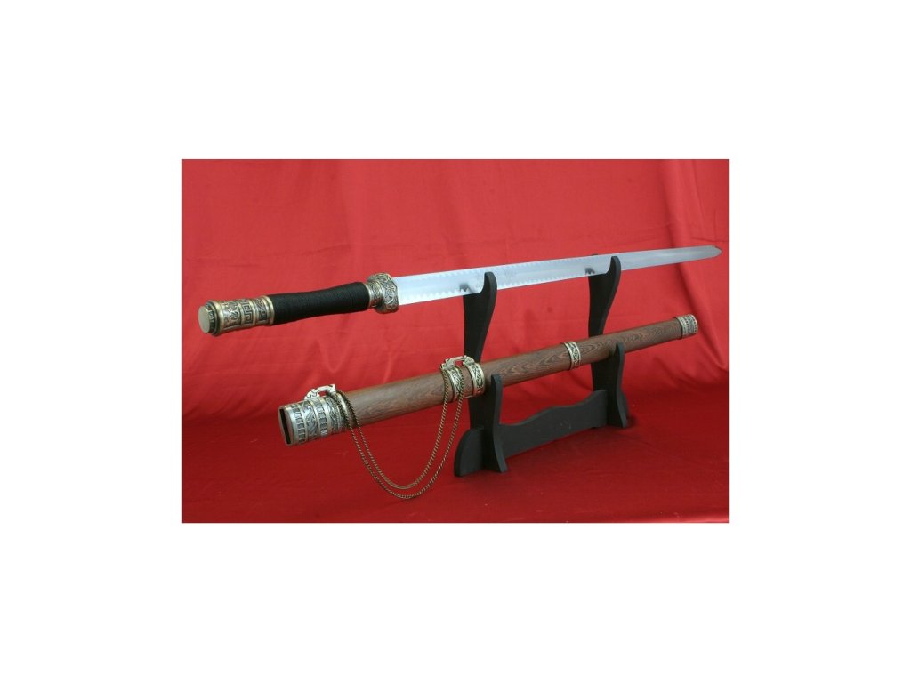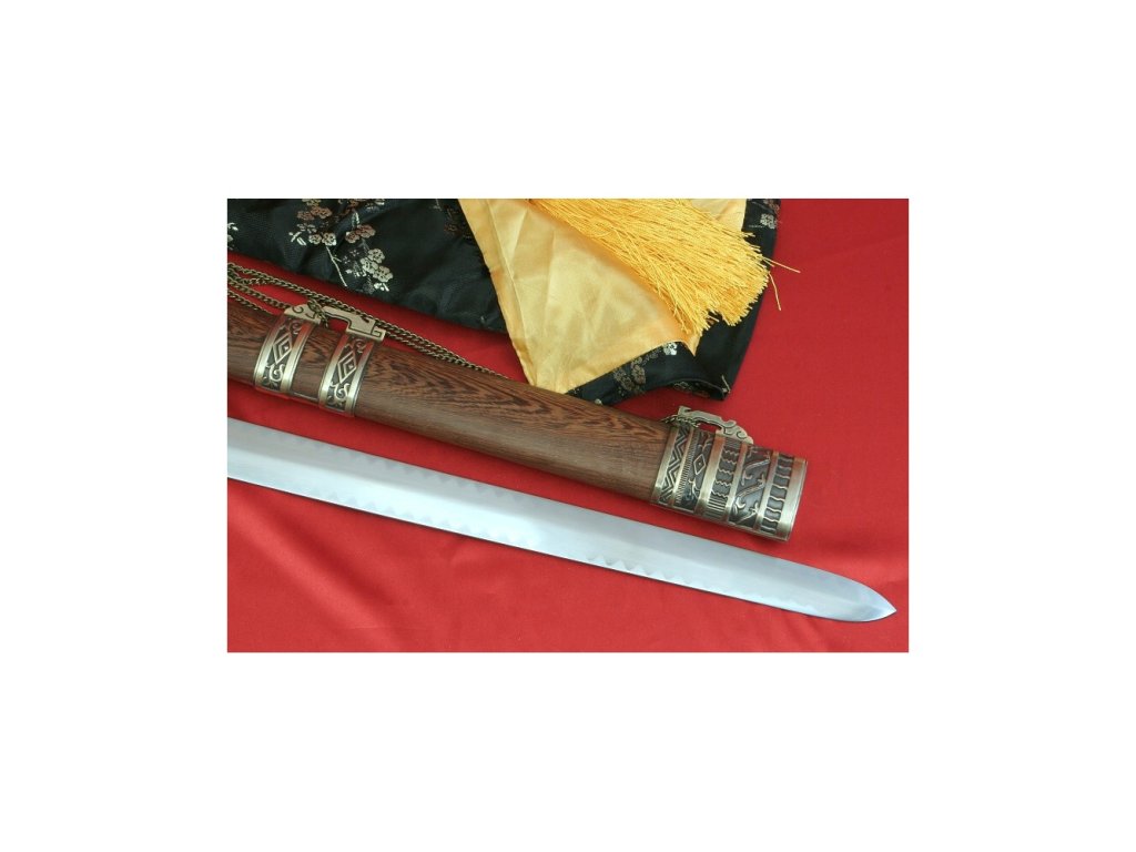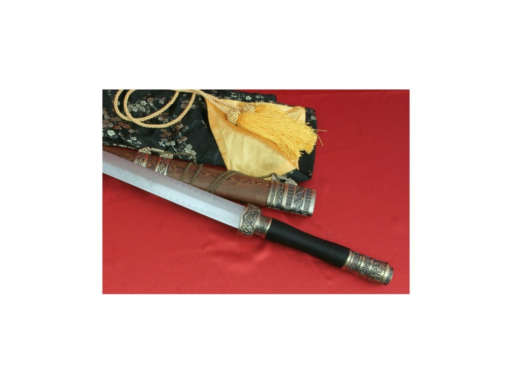 Čínský meč od firmy Kawashima s imitací hamonu, nebroušený. Čepel z karbonové oceli 1045. Rytiny na čepeli, dostupný čínský meč.