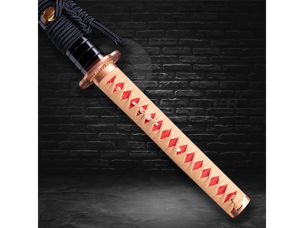 Rukojeť (tsuka) s dřevěným jádrem je potažena pravou rejnočí kůží (Samegawa) a omotána semišovou koženou šňůrou (Ito), což zajišťuje pevný úchop a estetickou eleganci. Dva bambusové kolíky (mekugi) pevně zajišťují čepel a umožňují snadnou demontáž.