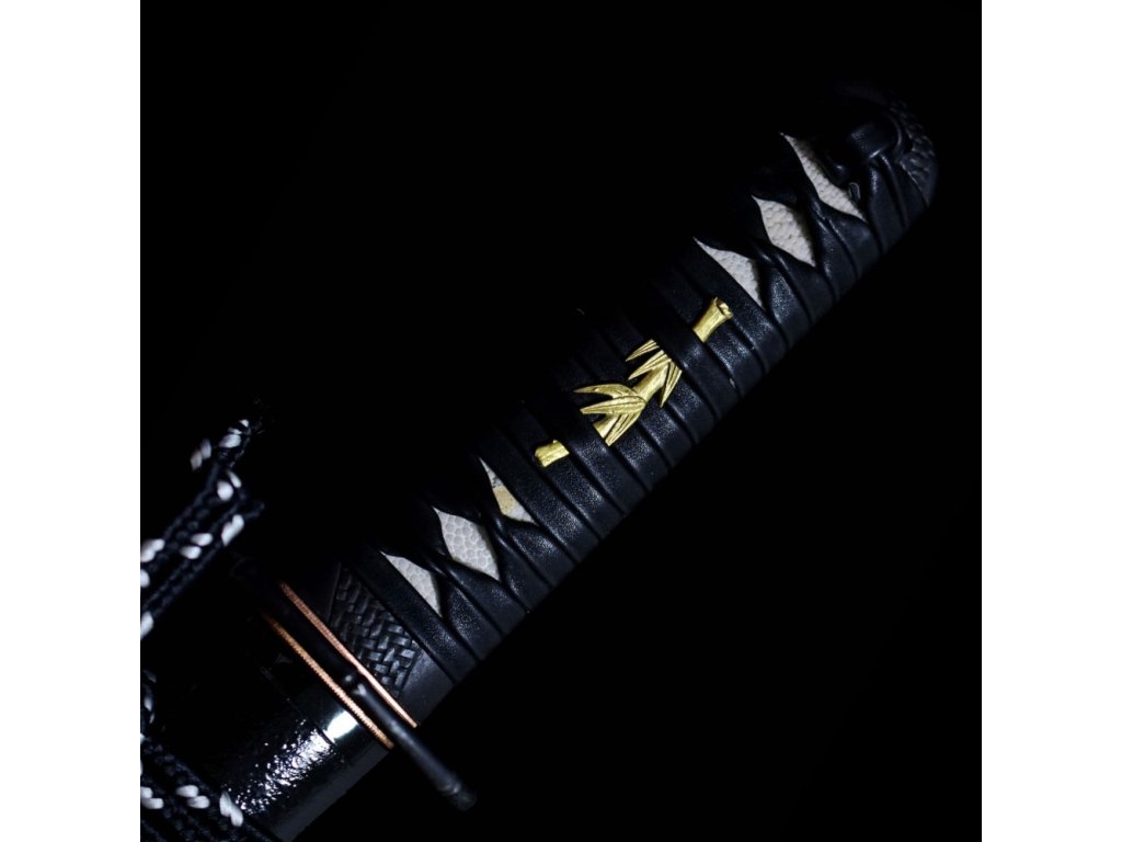 ✅ Tsuka: (rukojeť) dřevěné jádro, potažena pravou rejnočí kůží (Samegawa), s černou koženou omotávkou Ito. Čepel zajištěna 2 kolíky "mekugi", Menuki (ornament) z každé strany Tsuky