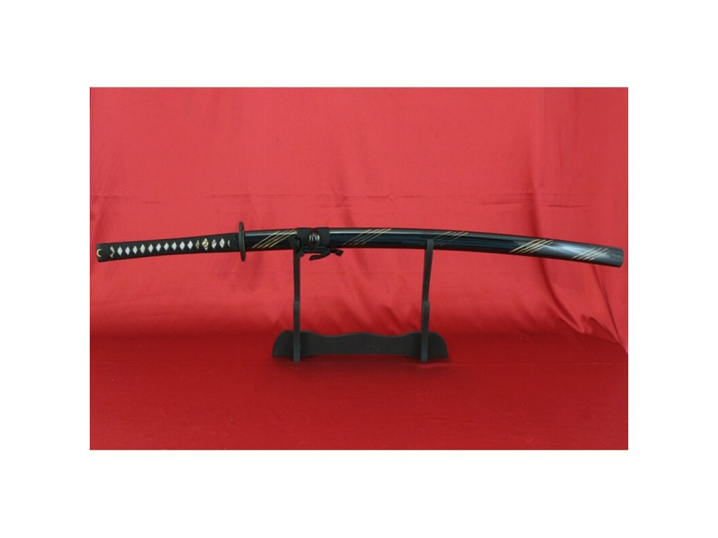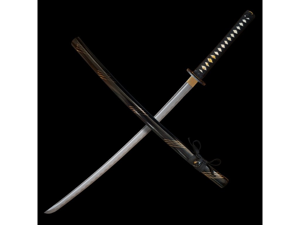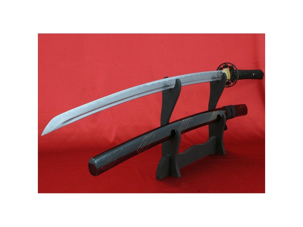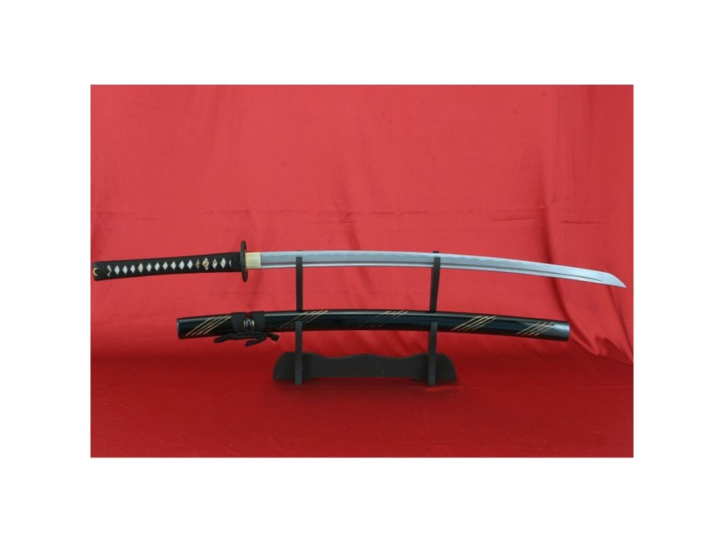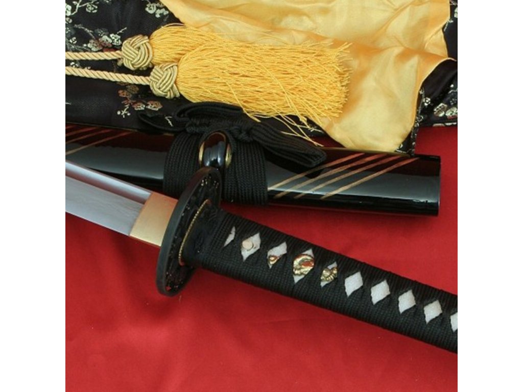Kovaný japonský meč TATSUTA s leštěnou imitací kalení (hamonu) a žlábkem Bo-Hi. Ostrý (broušený) samurajský meč KATANA najde své uplatnění jako dekorace, ale i k aktivnímu nácviku bojového umění. Katana není zcela vhodná k sekání tvrdších matreriálů. Ocel není parciálně zakalena (hamon je pouze leštěný) a proto má nízký stupeň tvrdosti. Sekání tvrdých materiálů by zanechalo stopy na ostří meče. Atraktivní a ostrá čepel, černá lesklá zdobená saya plus tsuka (rukojeť), která je potažena pravou rejnočí kůží, to vše dělá tuto katanu velmi zajímavou a žádanou. Katana je uložena v černém plátěném vaku a papírové krabici. Ostří katany zdobí leštěná imitace kalicí linky hamonu. Firma Dellinger se zříká jakékoliv odpovědnosti za zranění a poškození vzniklá při použití. Schraňujte katanu mimo dosah dětí ! Jakákoliv manipulace se samurajským mečem je na vaší vlastní odpovědnost. Nezapomeňte, že máte ve svých rukou smrtelnou zbraň !