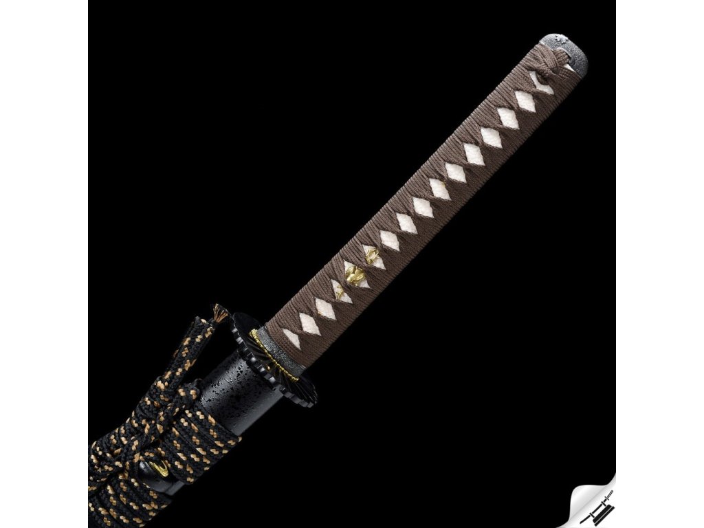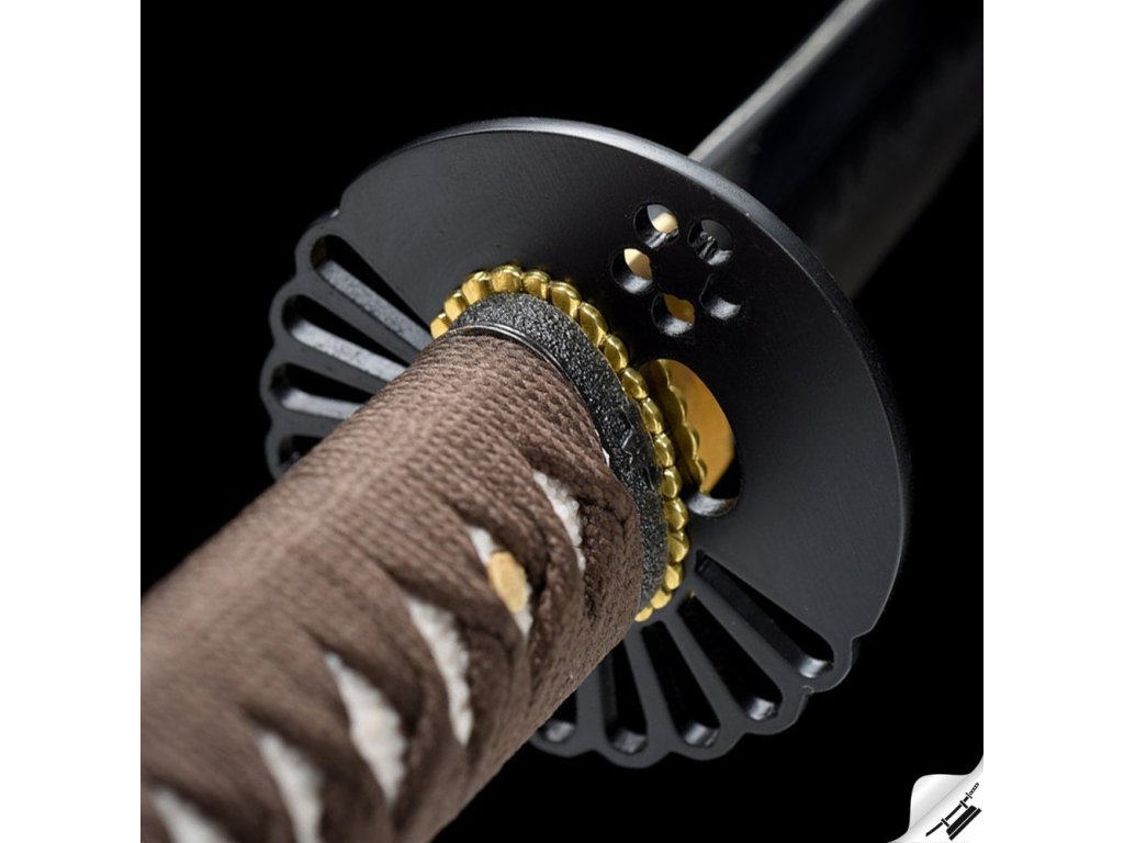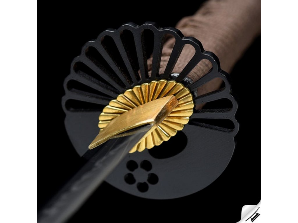 ✅ Tsuka: (rukojeť) dřevěné jádro, potažena pravou rejnočí kůží (Samegawa), s hedvábnou hnědou omotávkou ITO. Čepel zajištěna 2 kolíky "mekugi"
