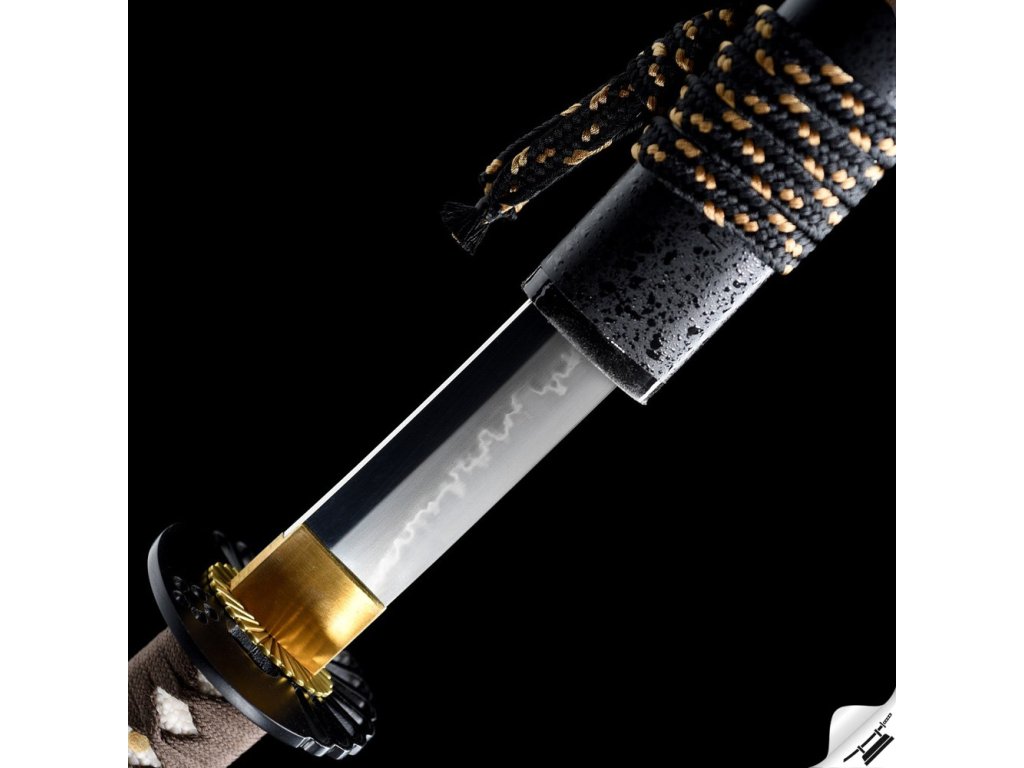 ✅ Tsuka - dřevěné jádro, potažena pravou rejnočí kůží (Samegawa), s hnědou omotávkou. Čepel zajištěna 2 bambusovými kolíky "mekugi"
