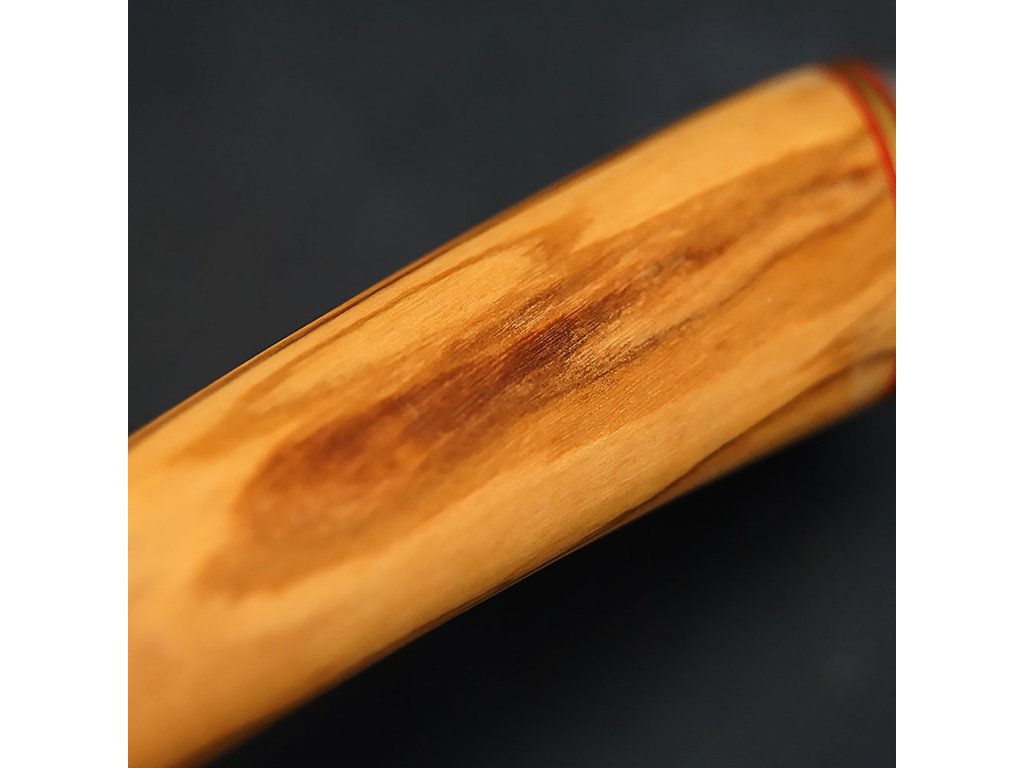 Rukojeť nože je vyrobena z prvotřídního olivového dřeva, známého svou pevností a přirozenou krásou. Toto dřevo se dobře leští a jeho atraktivní barevné odstíny dodávají noži nejen estetickou hodnotu, ale také dlouhou životnost. Rukojeť je ergonomicky tvarována pro maximální pohodlí a kontrolu během práce, čímž předchází únavě rukou.