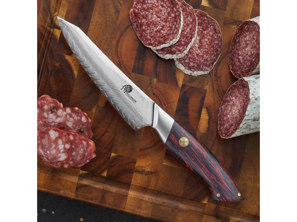 Elegantní a praktický kuchařský nůž Utility Kiritsuke 130 mm z exkluzivní řady Dellinger Volcano je dokonalým společníkem pro každodenní úkoly v kuchyni. Díky svému univerzálnímu designu v japonském stylu je ideální pro běžné krájení, loupání a dekorativní úpravy potravin. Spojuje tradiční japonské řemeslo s moderními technologiemi a designem.