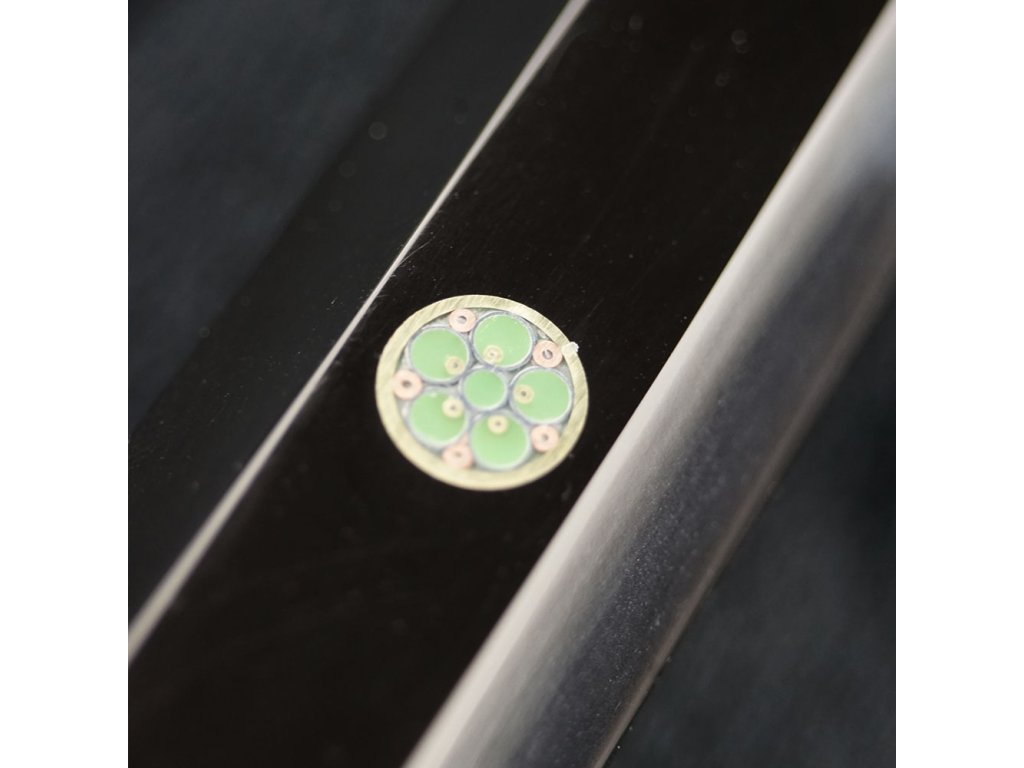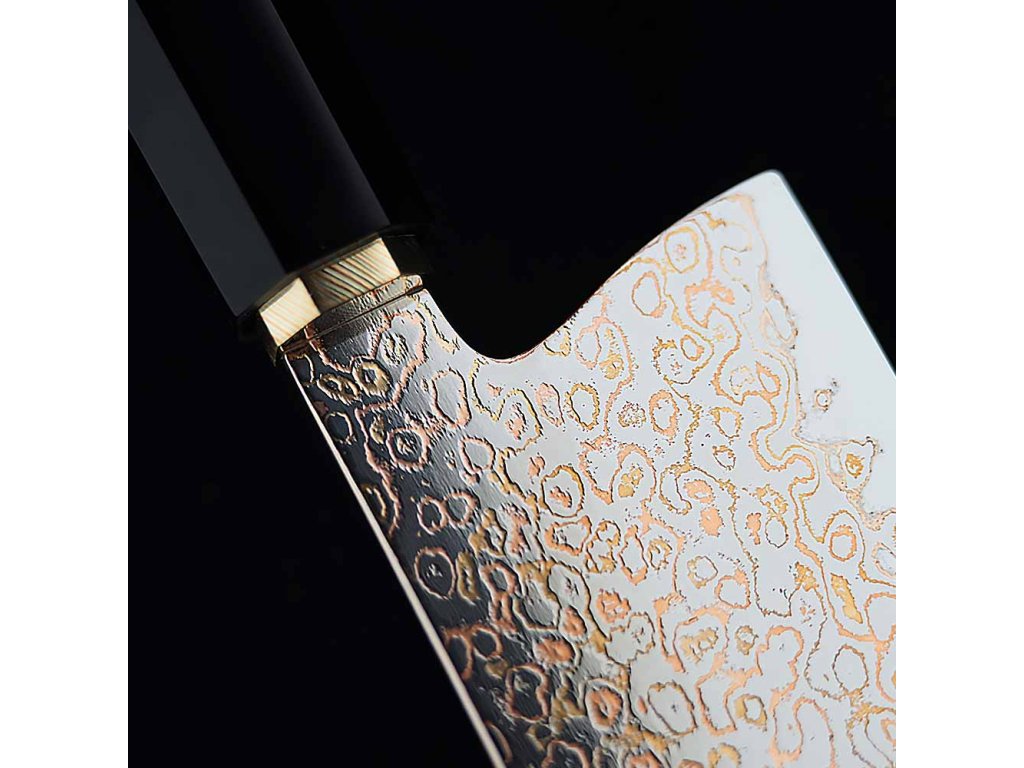 Základem čepele je funkční jádro z vysoce kvalitní nerezové oceli 10Cr15CoMoV s vysokým obsahem uhlíku, které zajišťuje vysokou tvrdost, stabilitu ostří a dlouhodobou řezivost. Jádro je tepelně zpracováno na tvrdost přibližně 60 ±2 HRC, což umožňuje velmi ostré broušení v úhlu 9–12° na stranu při zachování mechanické odolnosti při každodenním použití. Na toto jádro jsou následně řízeně nanášeny vrstvy nerezové oceli a mědi (cuprum), čímž vzniká charakteristická damašková struktura. Na rozdíl od klasického damašku zde vzor nevzniká skládáním a překládáním ocelí, ale precizním vrstvením kovů s rozdílnými fyzikálními a chemickými vlastnostmi. Měď se nepodílí na samotné funkci ostří – její úloha je primárně vizuální a strukturální v povrchových vrstvách, kde vytváří typické zlatavé linie a neopakovatelnou kresbu. Pro zvýraznění struktury damašku nejsou tyto čepele upravovány chemickým leptáním, ale mechanickou metodou pískování. Jemný proud abrazivních částic selektivně odstraňuje měkčí vrstvy materiálu a přirozeně odhaluje vnitřní strukturu oceli. Výsledkem je jemně matný, hedvábně lesklý povrch, který je nejen vizuálně atraktivní, ale také vykazuje vyšší odolnost vůči korozi, opotřebení a mechanickému poškození, a to bez použití chemikálií. Sendvičová konstrukce zároveň přispívá k lepšímu rozložení pnutí v materiálu. Kombinace tvrdého jádra a houževnatějších vnějších vrstev snižuje riziko vzniku mikroskopických trhlin a zvyšuje stabilitu čepele při dynamickém zatížení během krájení.