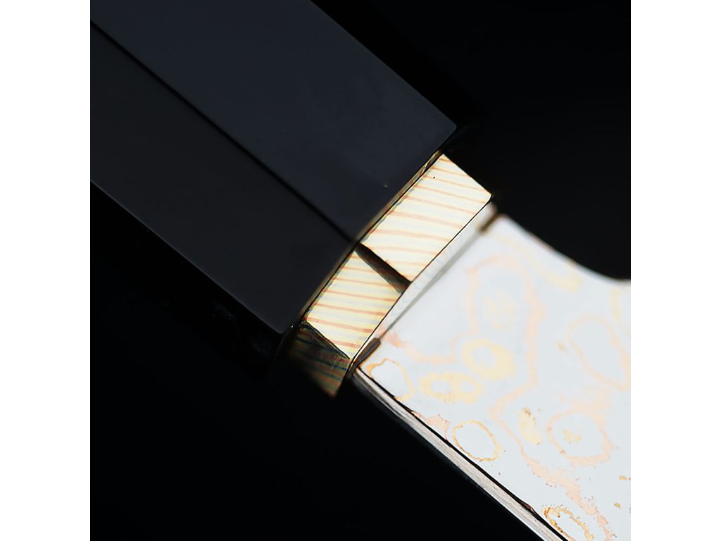 Rukojeť v tradičním osmihranném provedení poskytuje bezpečný a pohodlný úchop i v náročných podmínkách. Je vyrobena z černé pryskyřice a doplněna ozdobným středovým nýtem a bolstrem z damaškové oceli s příměsí mědi, který zajišťuje plynulý přechod mezi čepelí a rukojetí a podtrhuje celkový charakter nože.
