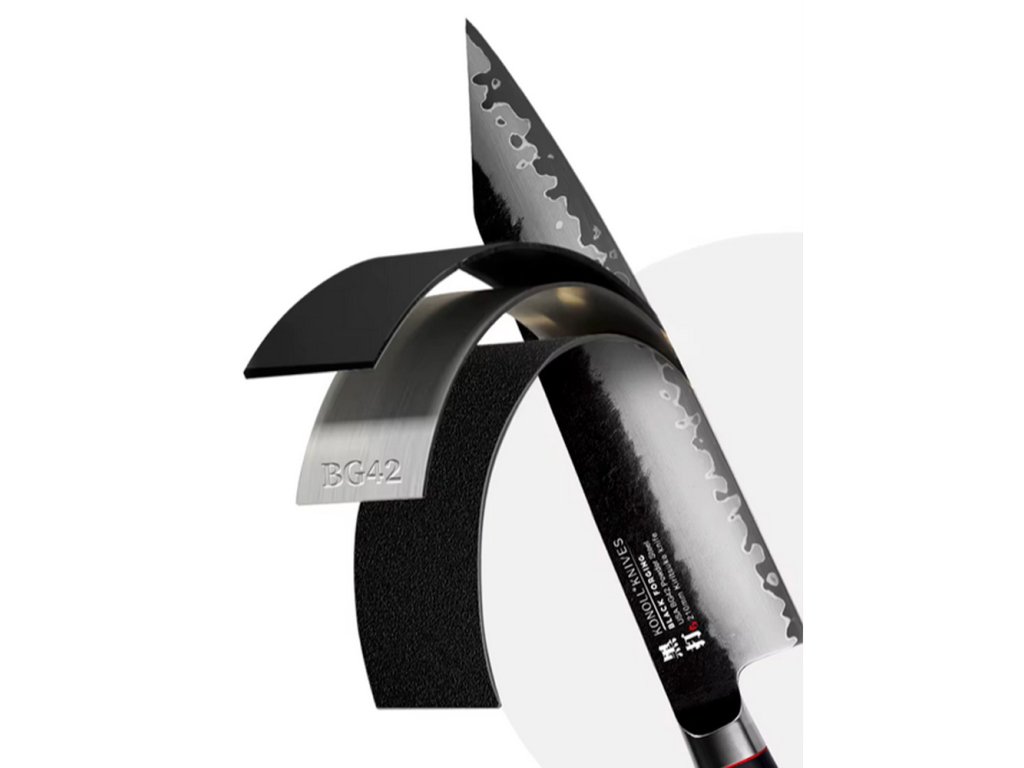 Prášková ocel BG-42 se u nožů typicky pohybuje v rozmezí 58–62 HRC (dle tepelného zpracování). Ostrost můžeš průběžně obnovovat broušením na vodních kamenech nebo kvalitních brouscích.