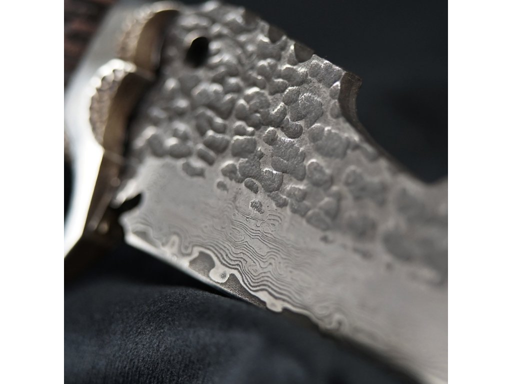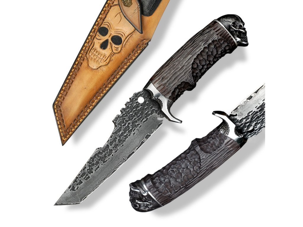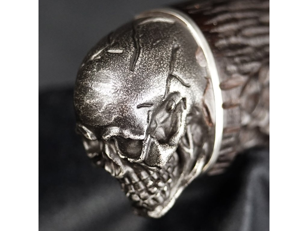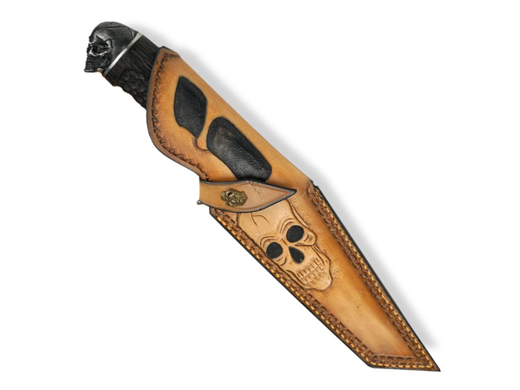 Rukojeť: Vyrobená z exotického dřeva Desert Iron-Wood, které pochází z rozsáhlých pouští v USA. Toto dřevo je těžší než voda a má přírodní barevnou variabilitu od světlého medu po jemný oranžový nádech. Rukojeť je ergonomicky tvarovaná pro pohodlný úchop a zpevněná masivním kováním s vyobrazením lebky, což dodává noži nejen praktičnost, ale i estetický prvek.