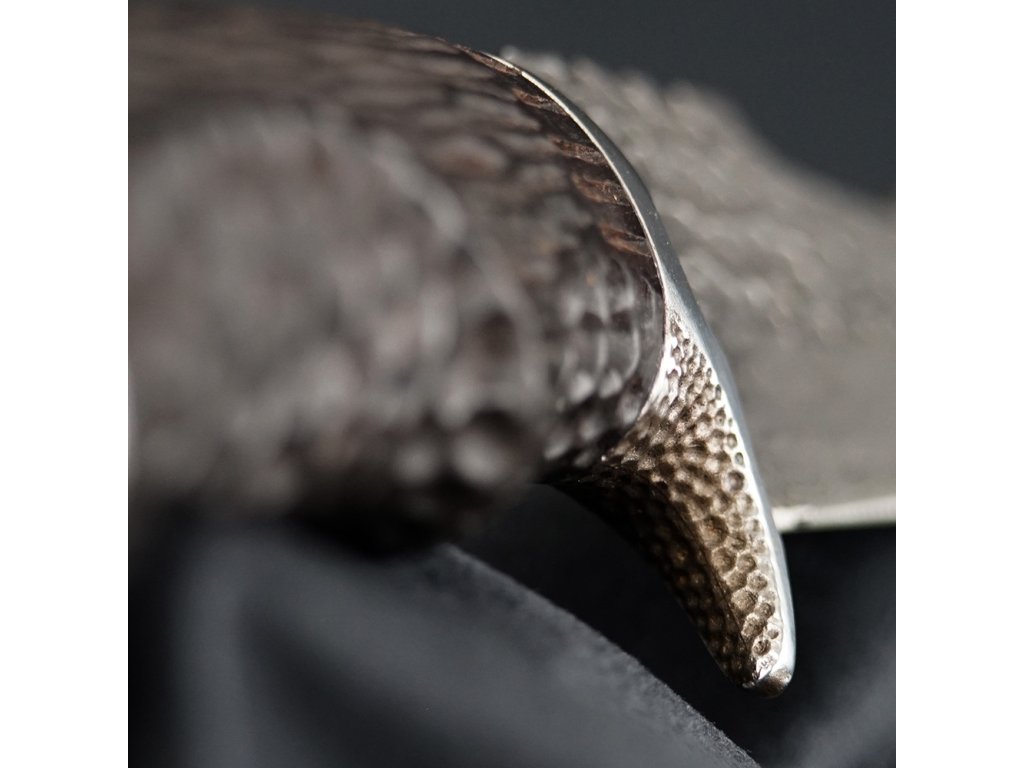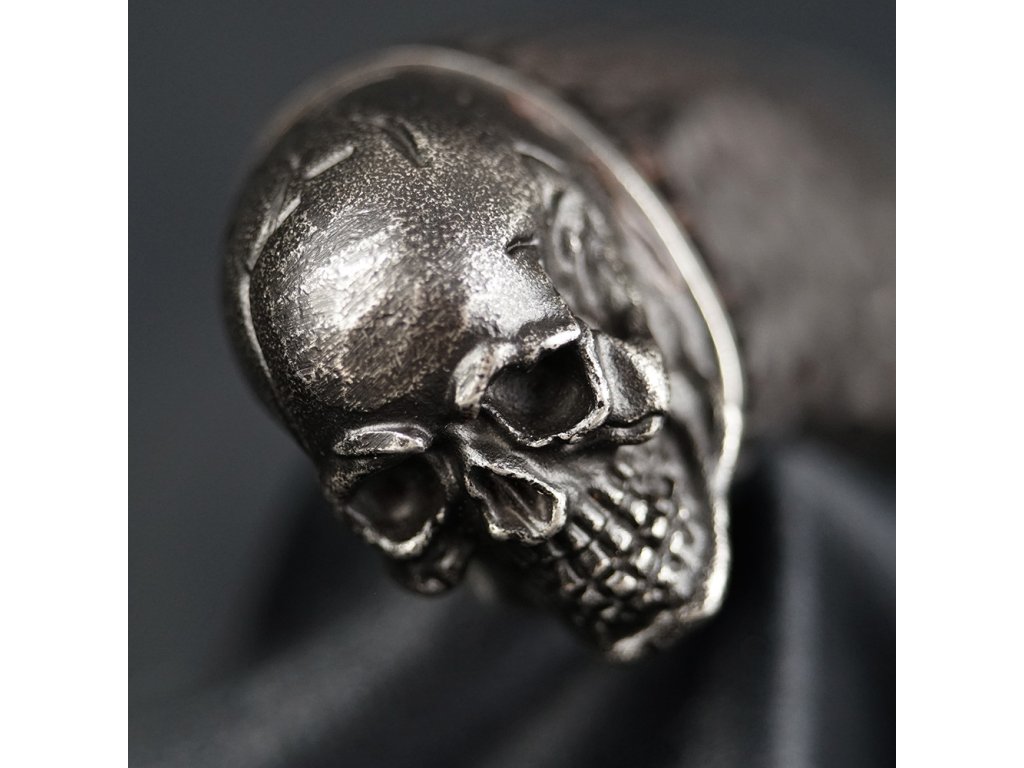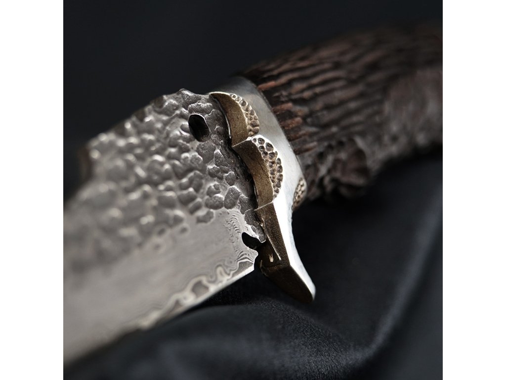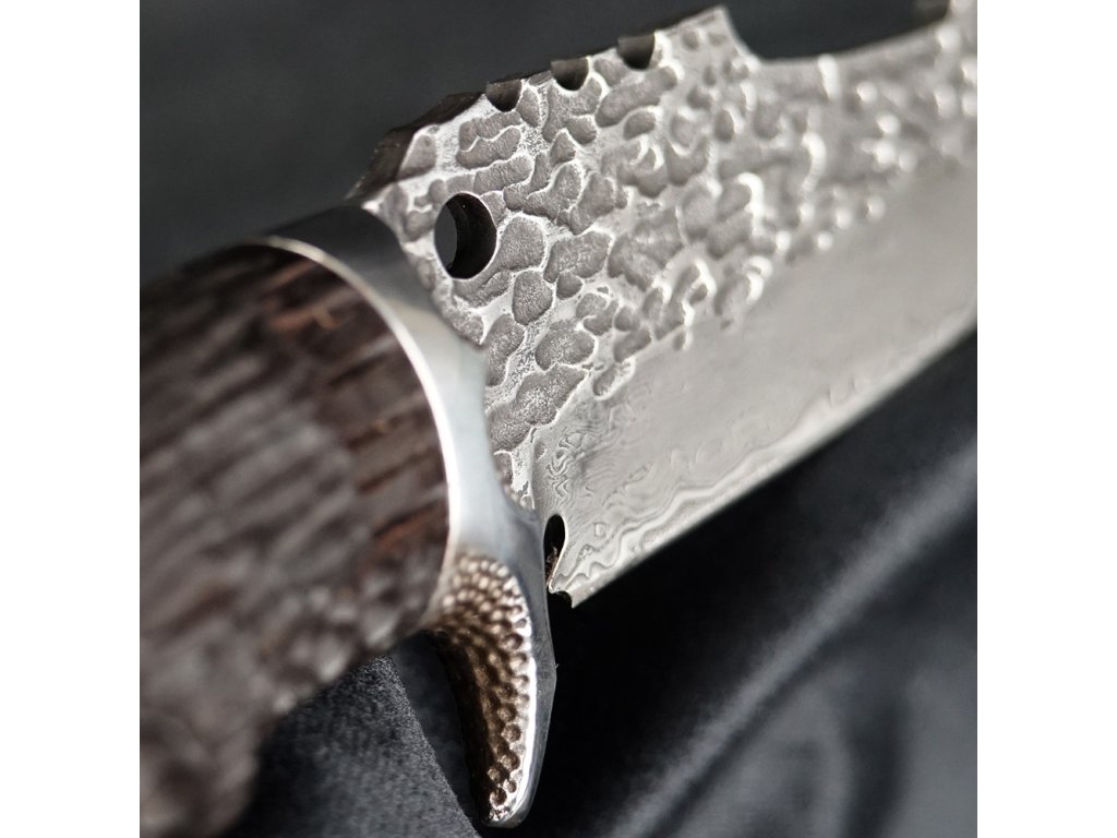 Rukojeť: Vyrobená z exotického dřeva Desert Iron-Wood, které pochází z rozsáhlých pouští v USA. Toto dřevo je těžší než voda a má přírodní barevnou variabilitu od světlého medu po jemný oranžový nádech. Rukojeť je ergonomicky tvarovaná pro pohodlný úchop a zpevněná masivním kováním s vyobrazením lebky, což dodává noži nejen praktičnost, ale i estetický prvek.