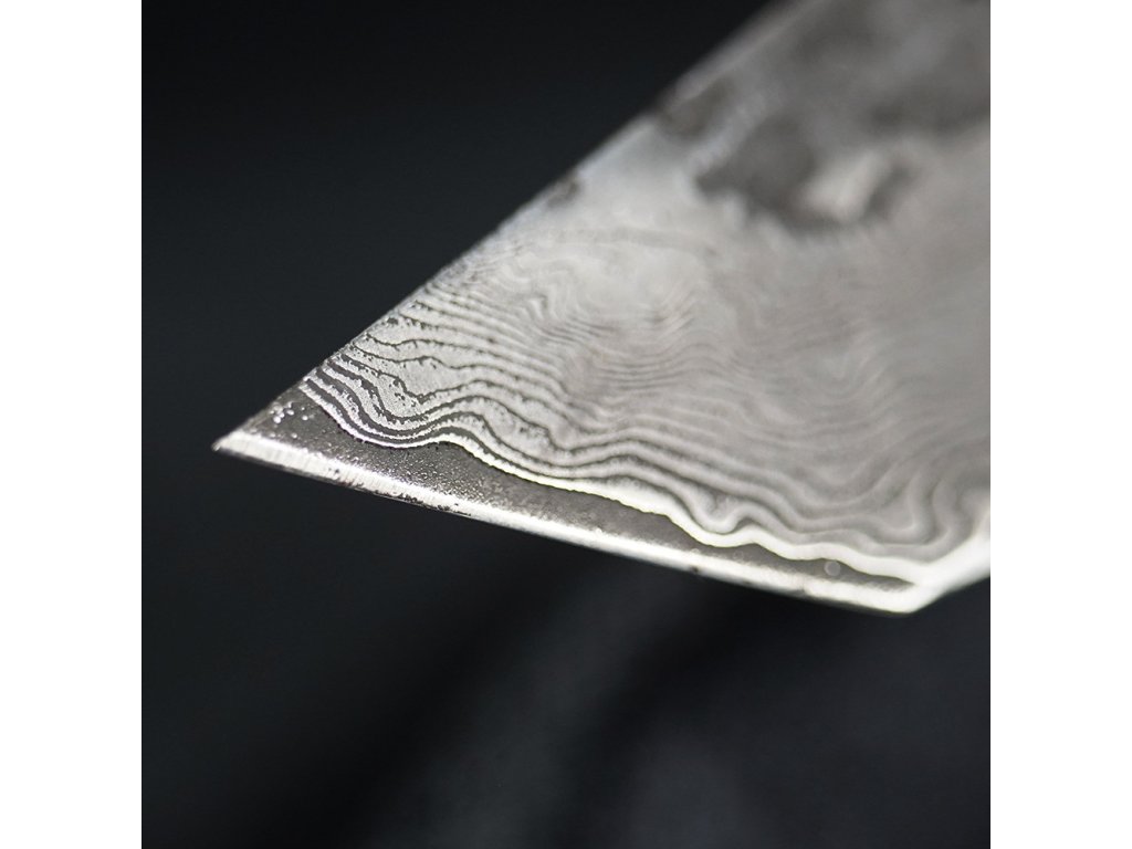 Čepel: Damašková ocel VG-10, známá svou výjimečnou ostrostí a dlouhou životností. Tvrdost čepele je kolem +/- 61 Rockwella, což zajišťuje mimořádnou odolnost a dlouhodobou ostrost.