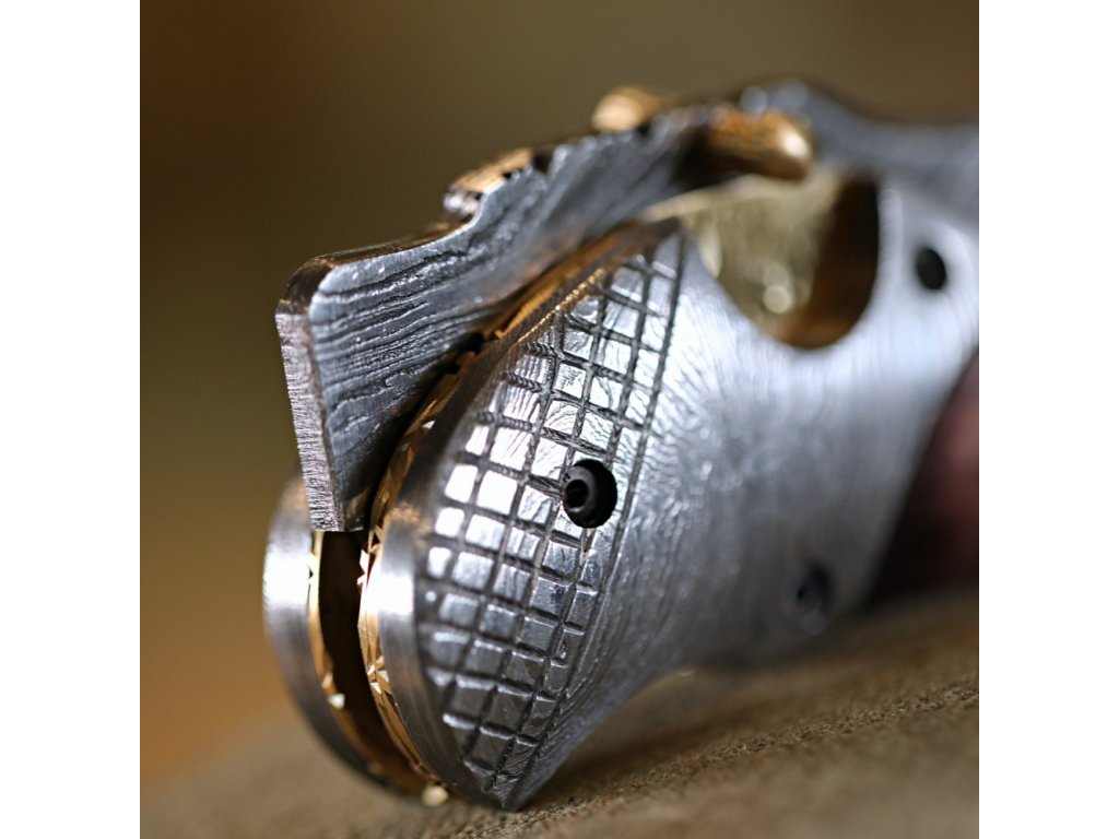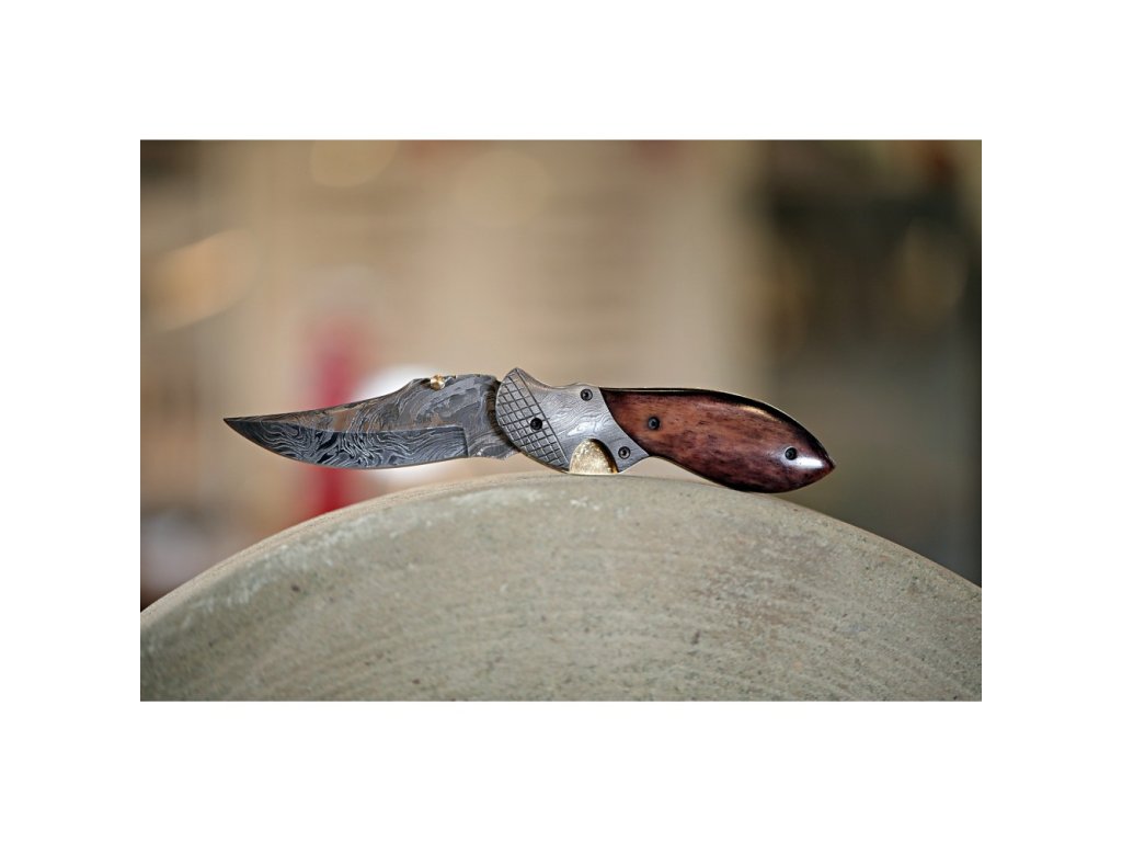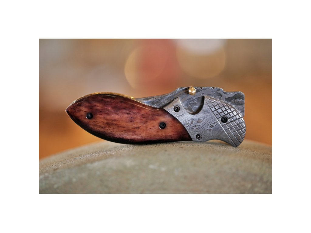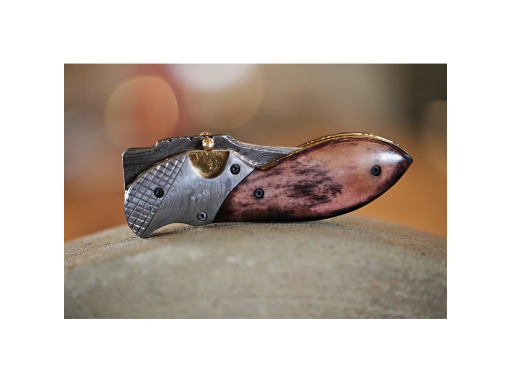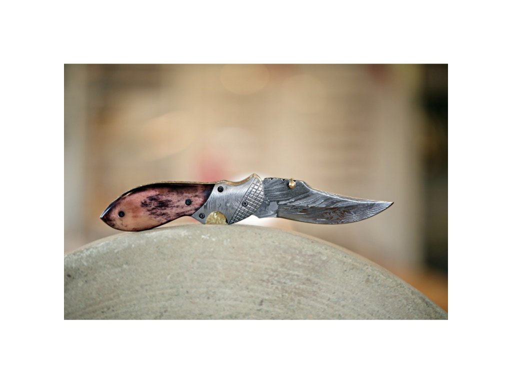 Zajímavý zavírací lovecký nůž z damascénské oceli s rukojetí z barvené velbloudí kosti (camel bone). Nůž je vyroben z 352 ručně překládaných vrstev ocelí 1095 a 15n20, což zajišťuje extrémně ostré a trvanlivé ostří. Jeho design a kvalita se stane jedinečným uměleckým dílem.