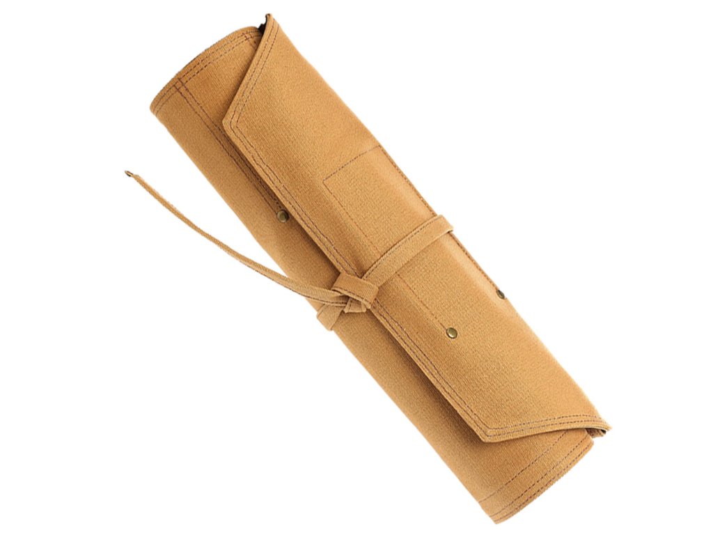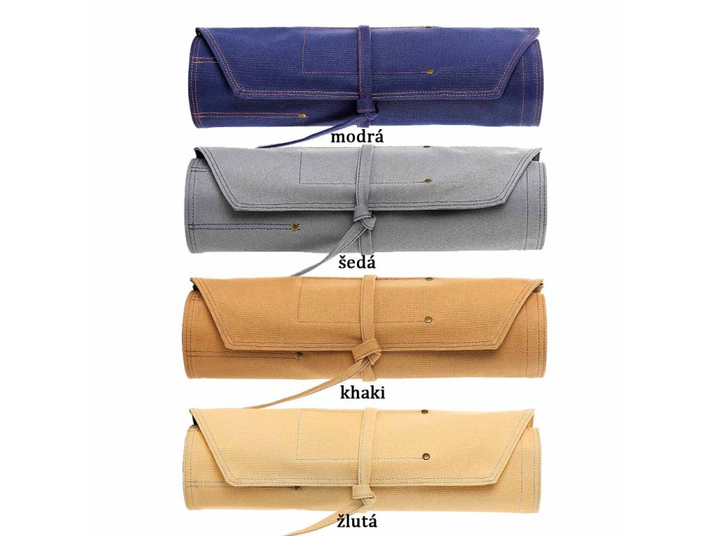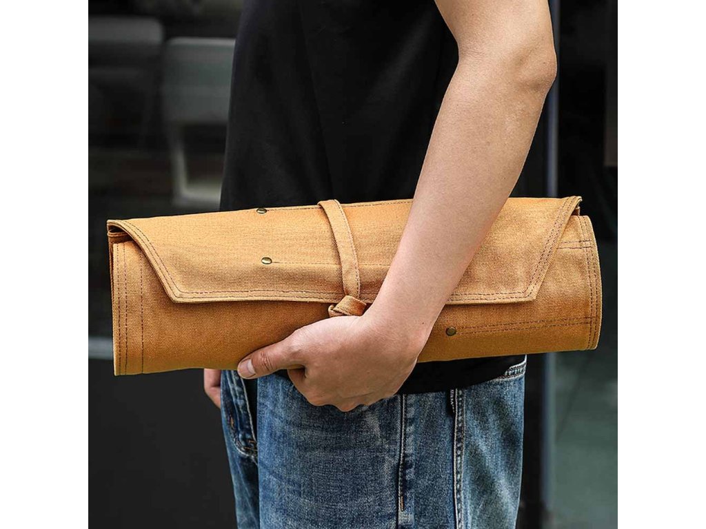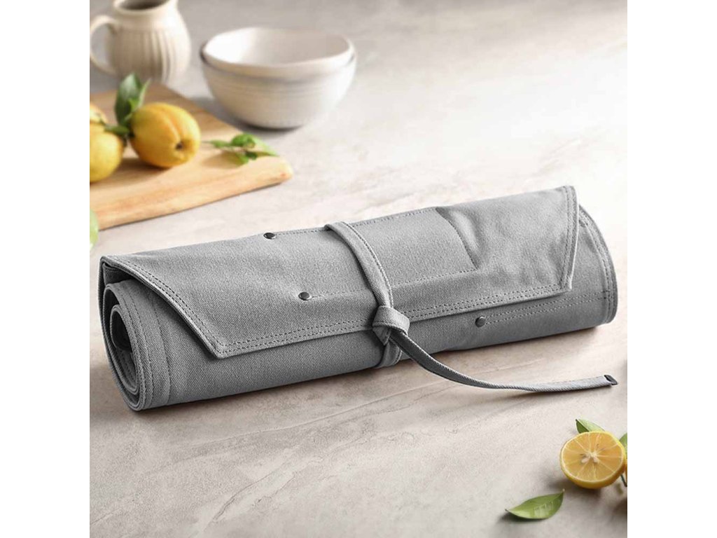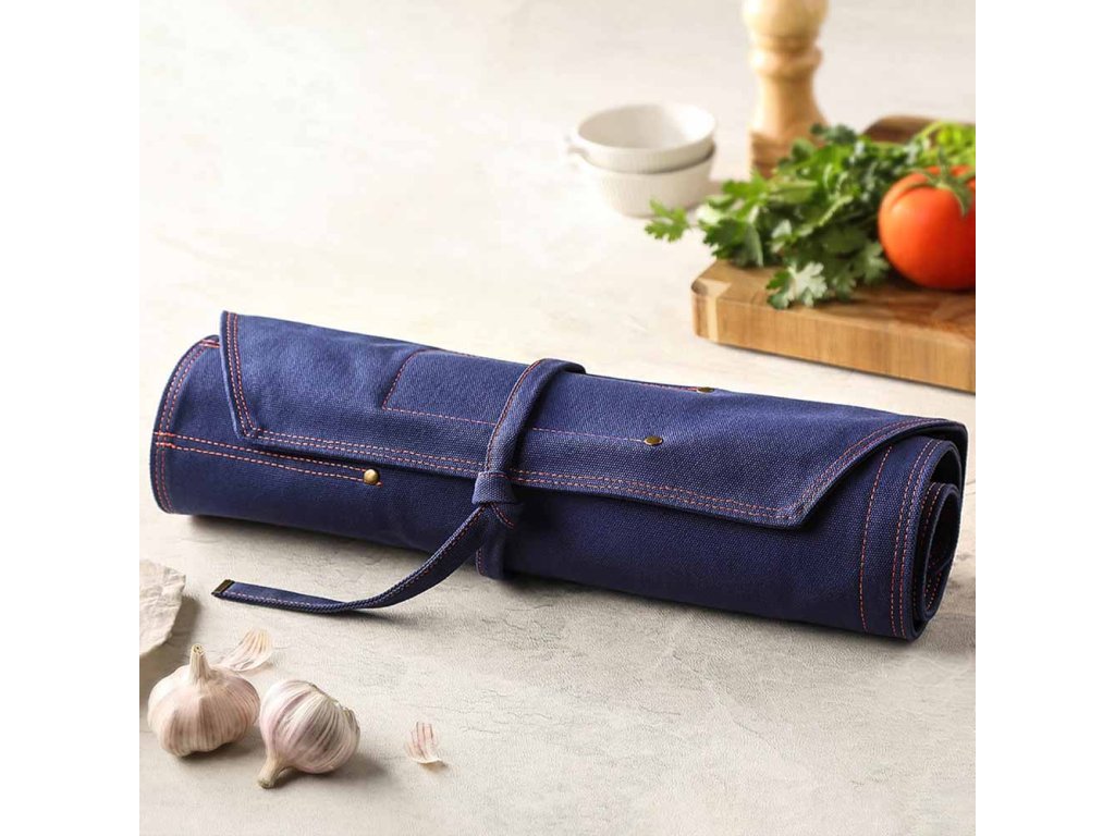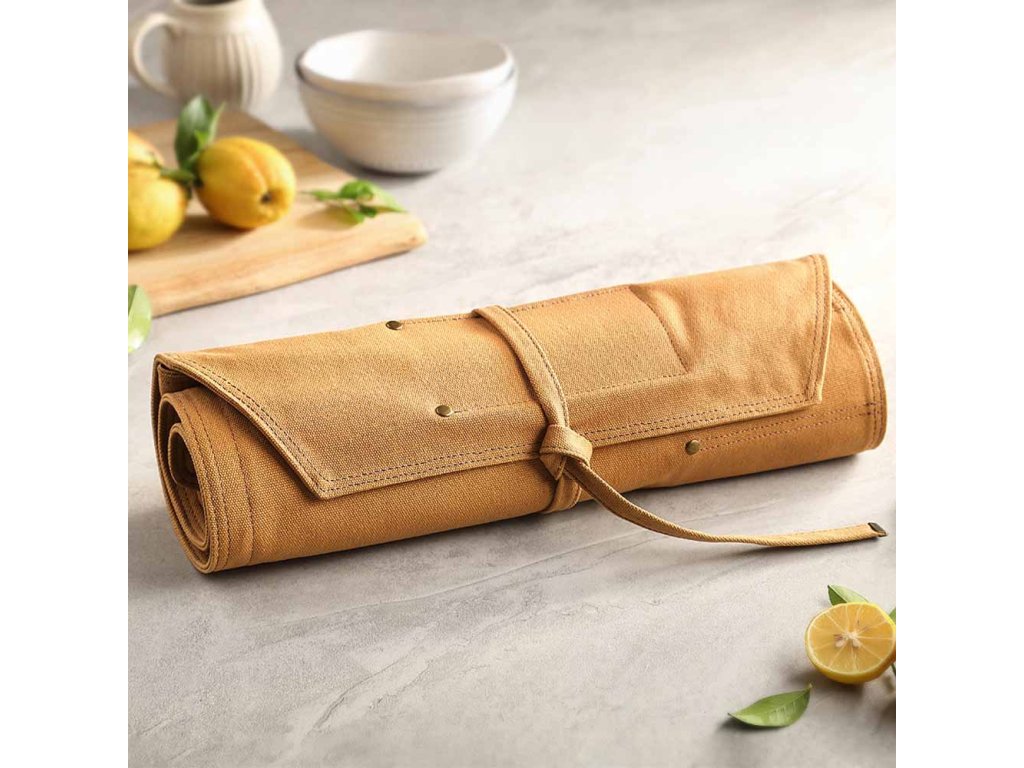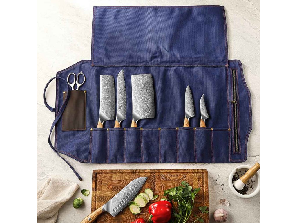 Ručně šitý bag (taška) na nože je dokonalým spojením elegance, praktičnosti a odolnosti. Vyroben z vysoce kvalitního vyztuženého plátna, nabízí bezpečné a stylové uložení pro osm kuchařských nožů, nůžky a další nezbytnosti.