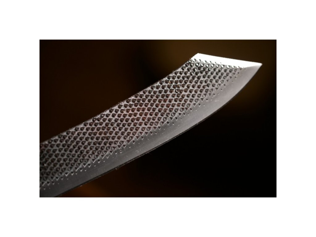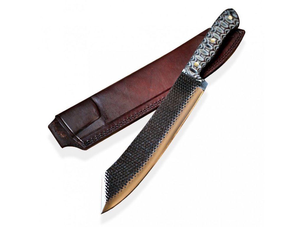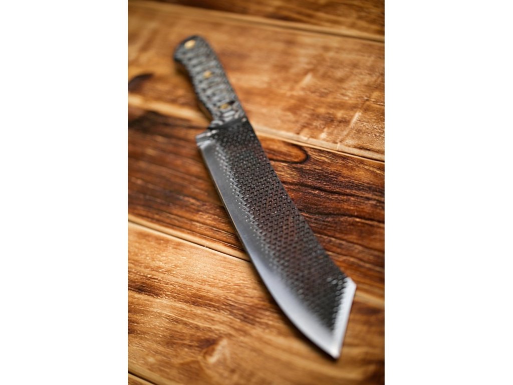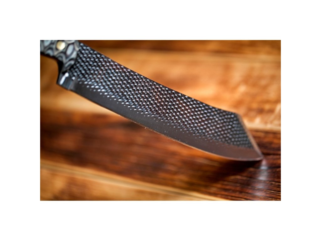 - Konstrukce: Mačeta je ručně kovaná a vyrobena z oceli D2, která po pečlivém vytvrzení a temperování dosahuje tvrdosti Rockwell 60-62 (HRC). Silná čepel z D2 oceli je odolná vůči opotřebení a zvládne i extrémní podmínky.