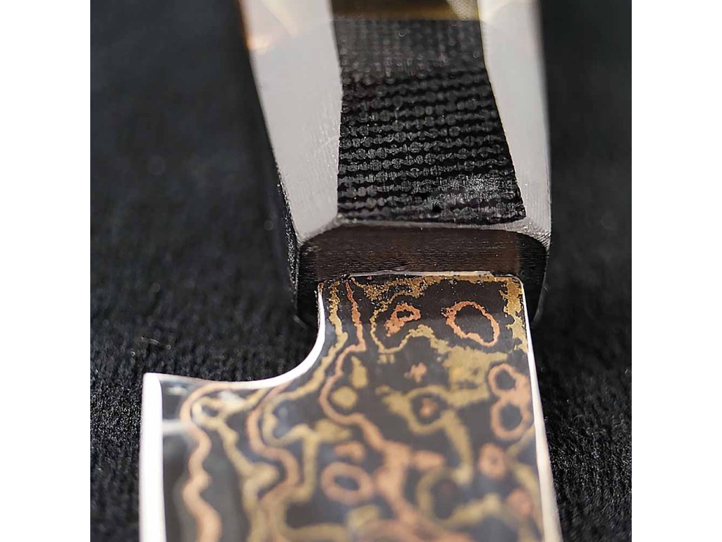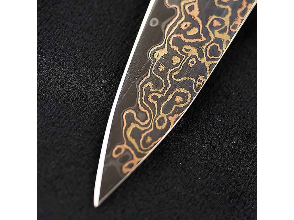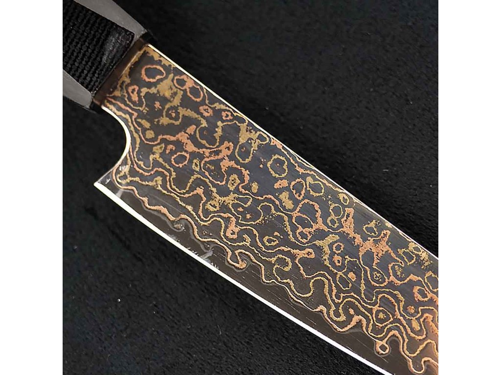 Nože vyrobené ze sendvičové damaškové oceli s vrstvami cuprum (mědi), které spojují špičkové funkční vlastnosti moderních materiálů s jedinečným vizuálním charakterem. Každá čepel je výsledkem precizního technologického procesu, kde má každý materiál přesně danou roli.