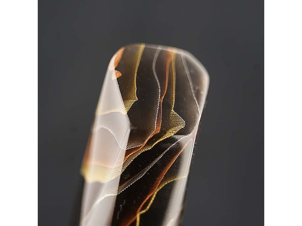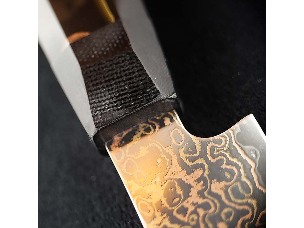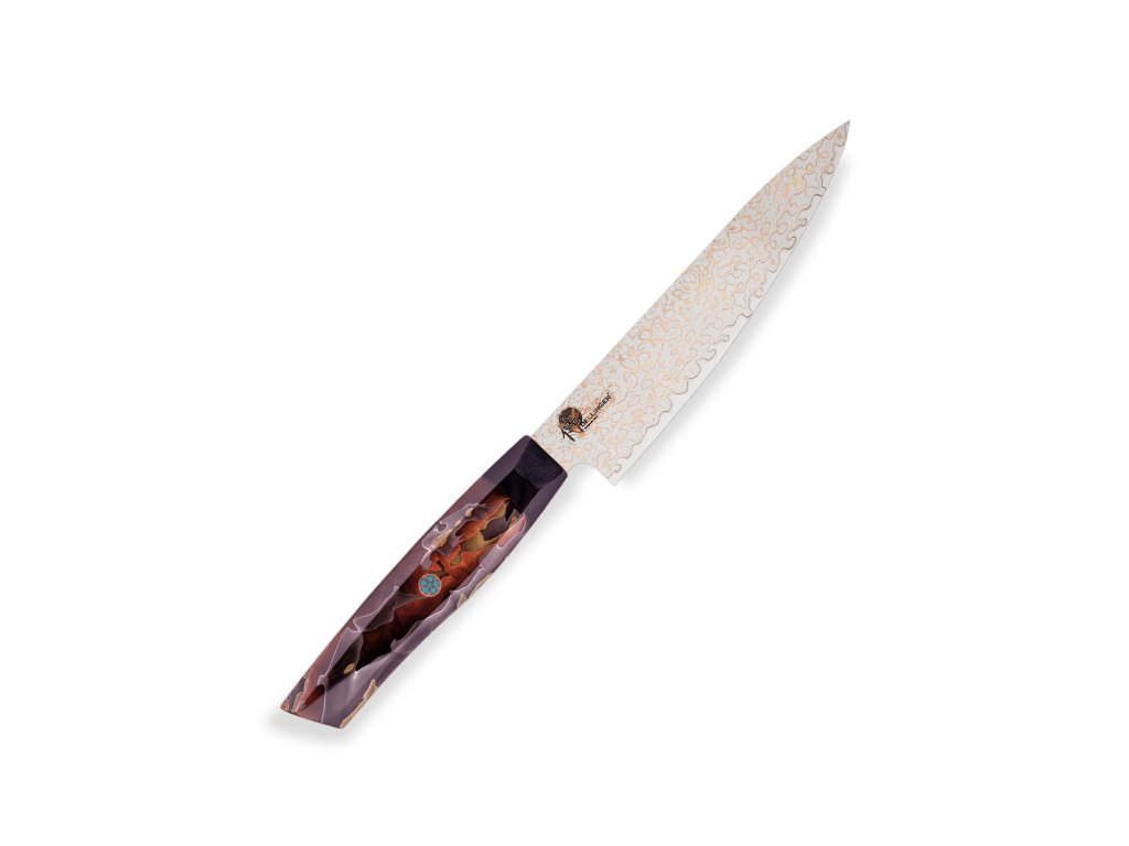 Šestihranná rukojeť z průhledné kompozitní pryskyřice s měděnou strukturou ve zlato-černé barvě s G10 objímkou a mozaikovým nýtem je ergonomická, hygienická a rozměrově stabilní, vhodná pro praváky i leváky. Tyto nože jsou ideální volbou pro každého, kdo hledá výkonný kuchyňský nůž japonského typu s originálním vzhledem, spolehlivými vlastnostmi a důrazem na detail.