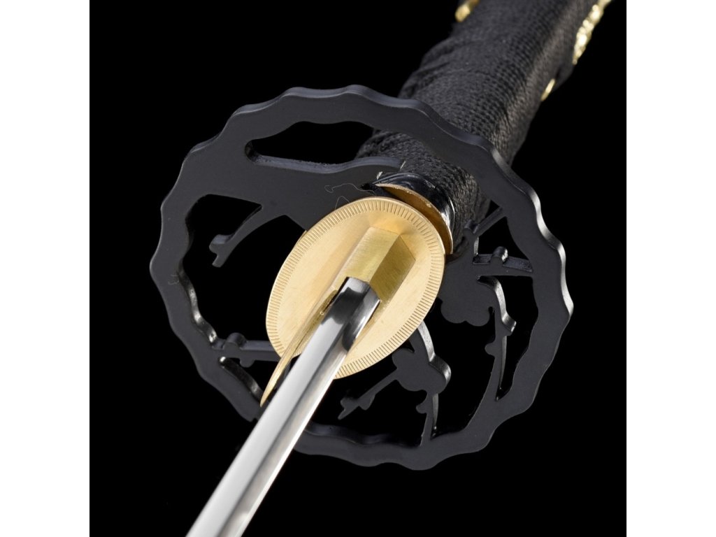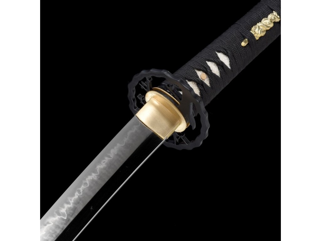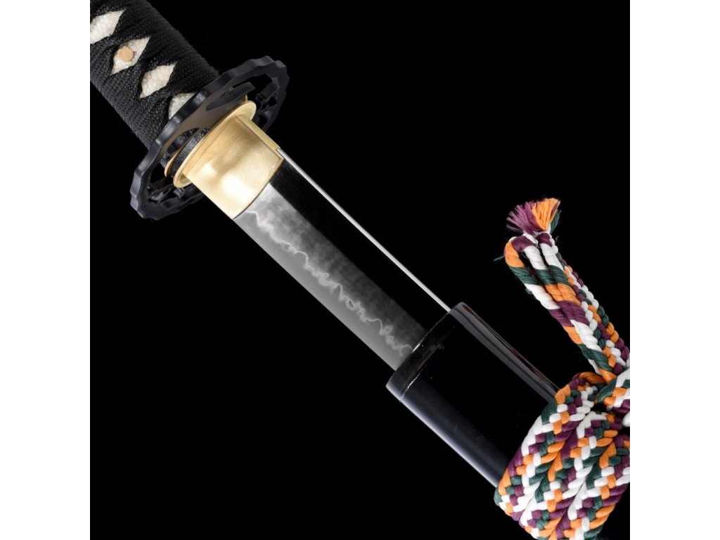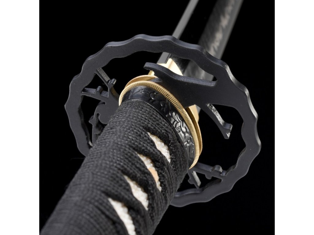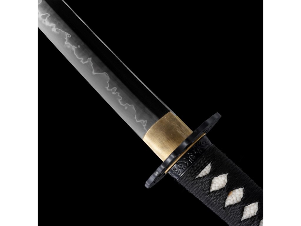 Výrazný reálný Choji hamon je tvořen dle dávných tradičních metod, které vychází z mnohaletých zkušeností kovářského mistra, který výrobou této nádherné zbraně strávil 45 pracovních dnů. Vše na tomto meči je individuálně zhotoveno, včetně saye a habaki, jsou použity nejkvalitnější komponenty, včetně špičkového laku na sayu, japonského hedvábí a skutečné rejnočí kůže nejvyšší kvality. Čepel bez bo-hi byla ve finální fázi leštěna kamenem hazuya - tím je dosaženo téměř žiletkového ostří (razor sharp). Jedná se o špičkovou repliku samurajského meče, která je vhodná k sekovým zkouškám a lze ji rozložit na jednotlivé části. Tato čepel byla vyzkoušena a testována tak, aby odstranila vše co jí stojí v cestě ! Sori (zakřivení čepele) je speciálně navrženo tak, aby bylo dosaženo co možná nejjemnějších a nejčistších řezů. To vše v kombinaci s výběrem tradičního kovaného Koshirae zaručuje, že získáte to nejlepší z hlediska vzhledu i funkčnosti. Uhlíková ocel T-10 má působivou tvrdost HRC 58 - perfektní kombinace této tvrdosti je podtrženo zakřivením čepele Sori, které umožňuje snadné přeseknutí tatami, slaměné rohože, nebo bambusu pro tameshigiri. Full tang konstrukce této katany výrazně zvyšuje sílu meče. Čepel je typu shinogi-zukuri, tento typ čepele se vyrábí od 10.století našeho letopočtu. Hrot meče ko kissaki se skutečným Diamond-Shaped Yokote, které je velmi dobře definováno tím, že hamon prochází po celé délce přes Boshi. Yokote je velmi důležité pro strukturální integritu špičky meče. Pomáhá absorbovat otřes, rozptýlí sílu a přispívá k stabilitě a síle meče při tzv. sekořezu. Tato katana (samurajský meč) je vhodná na použití v praxi, firma Dellinger se však zříká jakékoliv odpovědnosti za zranění a poškození vzniklá při použití. Schraňujte mimo dosah dětí ! Jakákoliv manipulace se samurajským mečem je na vaší vlastní odpovědnost. Nezapomeňte, že máte ve svých rukou smrtící zbraň !