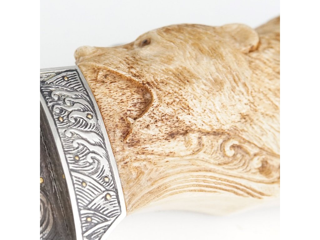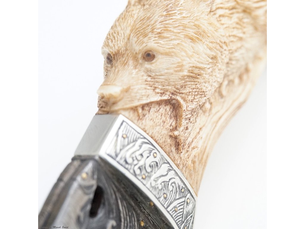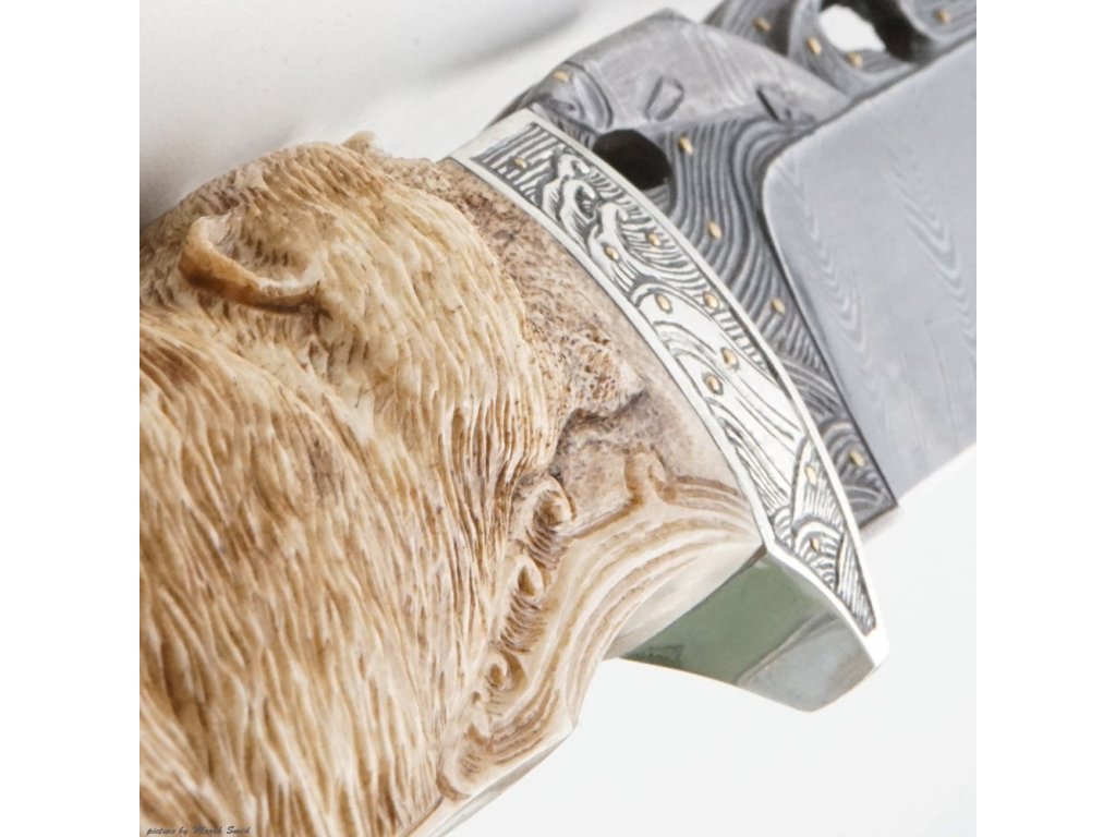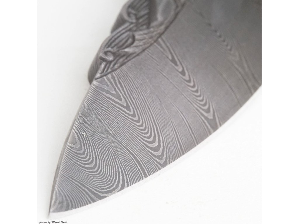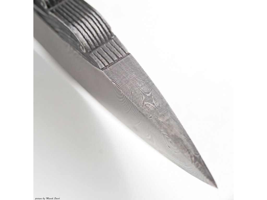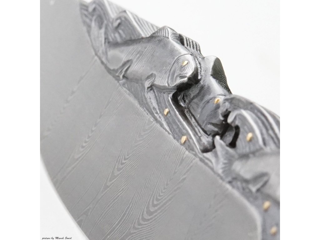 Jedinečný nůž "Bear Sign Engraved" čepel ze švédské damaškové oceli SANDVIK 19C27+440C+1095 mosaic pattern. Rukojeť z paroží jelena s ručně rytým vyobrazením medvěda. Nepřehlédnutelný vzor damaškové oceli s rytinami lososů v peřejích a ručně ryté rukojeti tvoří perfektní a jedinečný pár. Konečný výsledek je naprosto dechberoucí a bezpochyby se jedná o vyjímečné umělecké dílo.