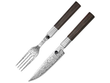 Elegantní vidlička a nůž z damaškové oceli VG-10 s extrémní ostrostí pro snadnou manipulaci s masem při grilování a servírování. Perfektní a praktický doplněk na vaši...