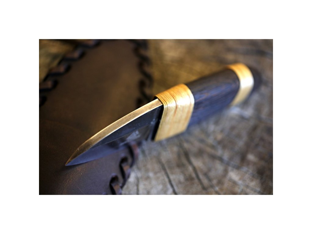 Rukojeť: Rukojeť je vyrobena z exotického dřeva Wenge, které poskytuje příjemný a esteticky působivý úchop. Pro lepší manipulaci je kolem rukojeti navlečen konopný provaz.