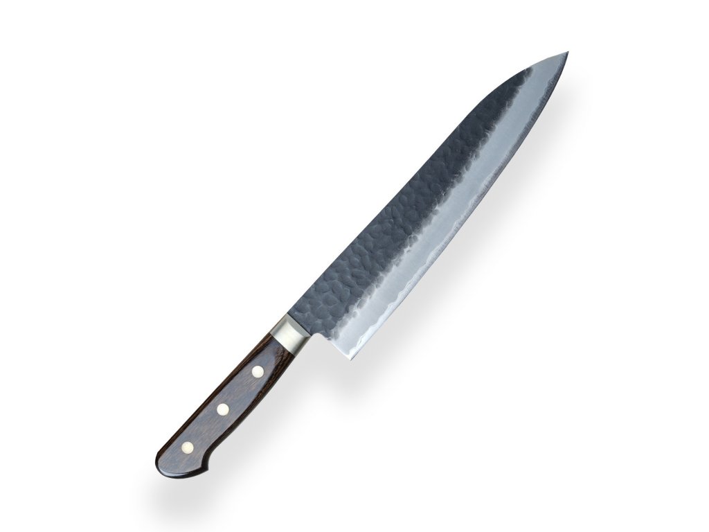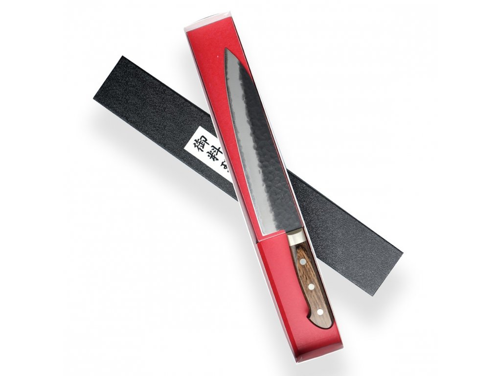 Překrásný všeobecně použitelný nůž Gyuto z oceli AOGAMI Super steel s působivým designem a nejvyšší kvalitou. Překrásný a velmi ostrý japonský nůž KIRITSUKE / Chef (délka čepele 240 mm) z oceli AOGAMI Super steel s působivým designem a nejvyšší kvalitou. Hřbet nože a ostří se zužují do špičky pro všestranné využití mimořádné řezné síly. Krájení, plátkování, čištění masa, ovoce a zeleniny – nic nebude pro tento jedinečný nůž japonského tvaru problémem. Kuchařský nůž GYUTO je díky výše položenému hrotu, též vhodný ke kolébkovému krájení bylinek, zeleniny a ořechů. Dlouhá čepel a evropský styl rukojeti Vám poskytne tu nejlepší kontrolu při řezání a krájení.