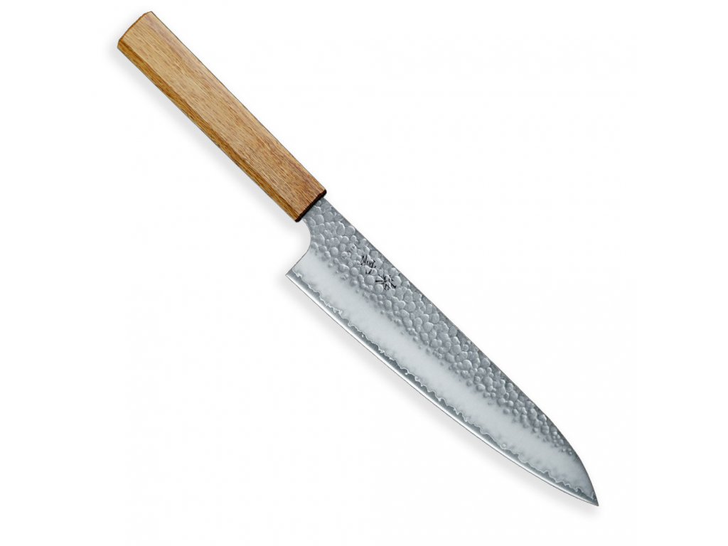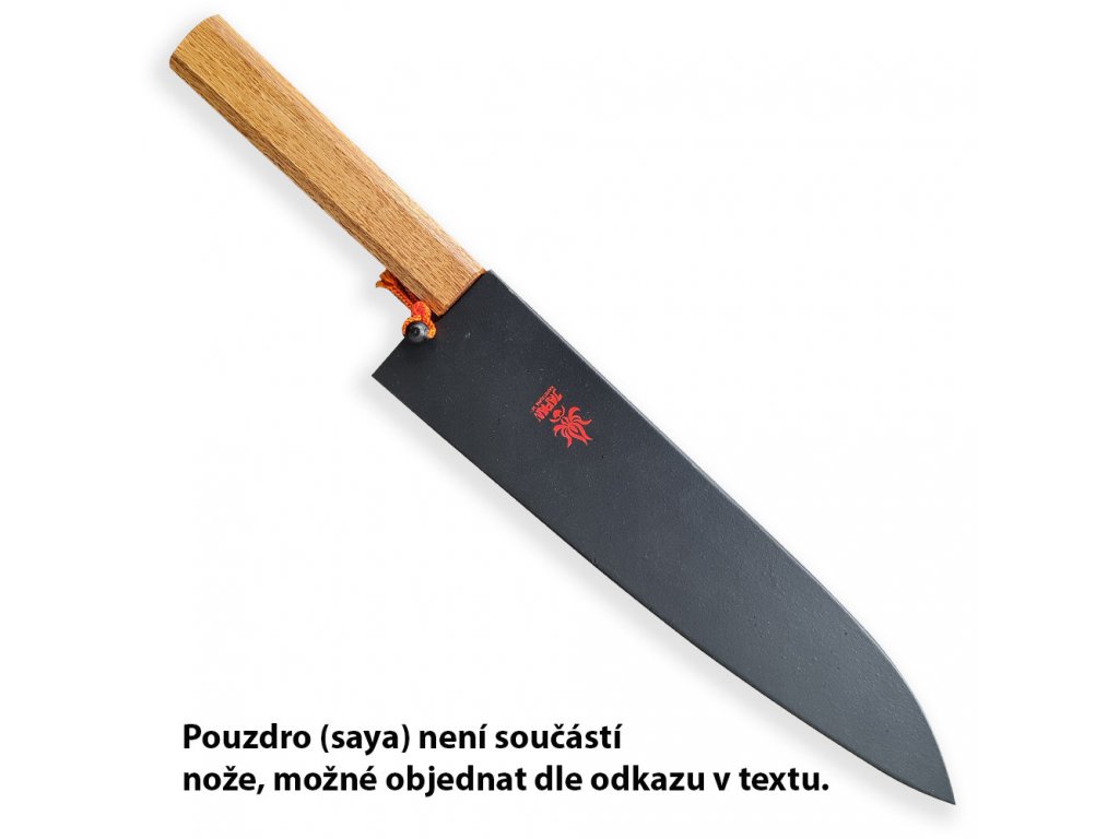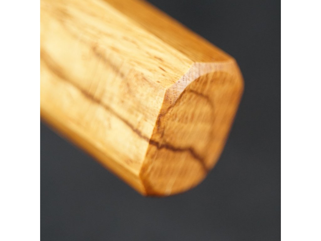 Oktagonová rukojeť je vyrobena z tradičního japonského dubového dřeva, pečlivě ručně leštěná a ergonomicky tvarovaná pro optimální ovládání. Tento nůž je vhodný pro použití pravou i levou rukou.