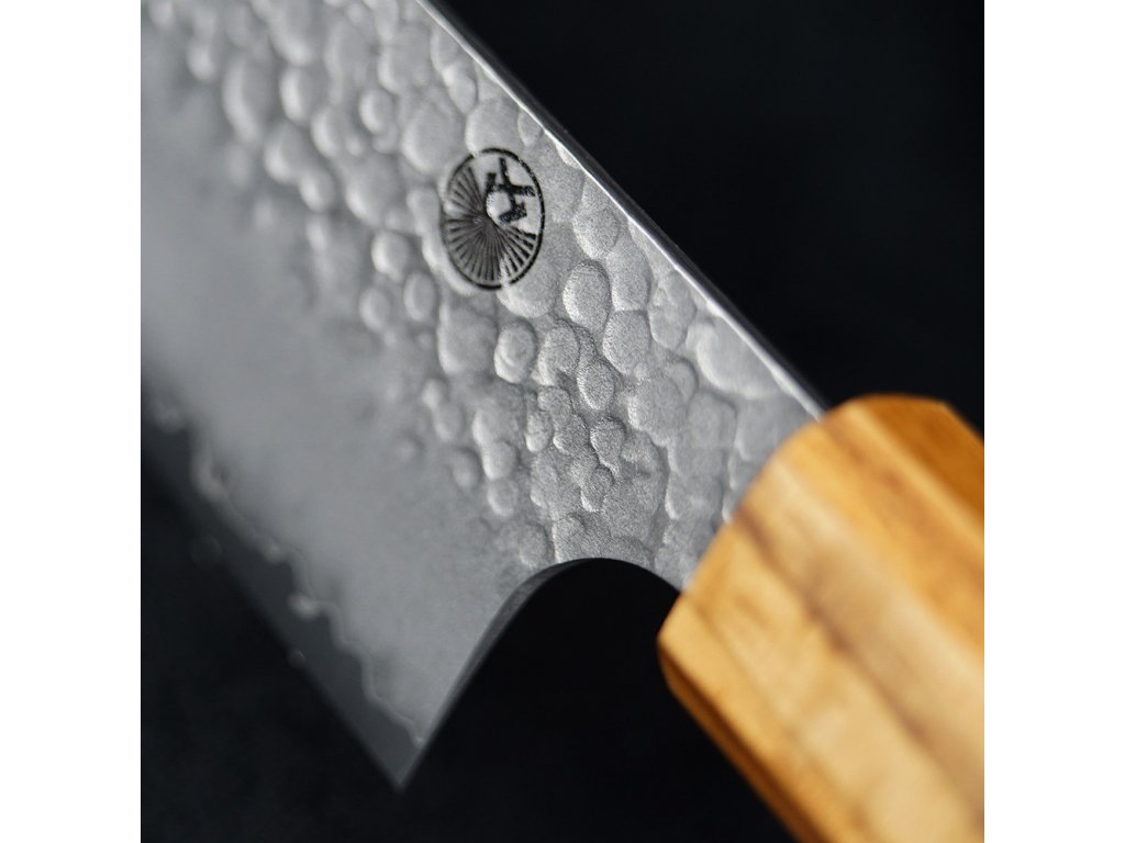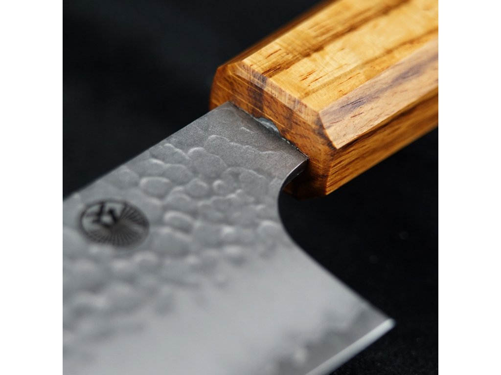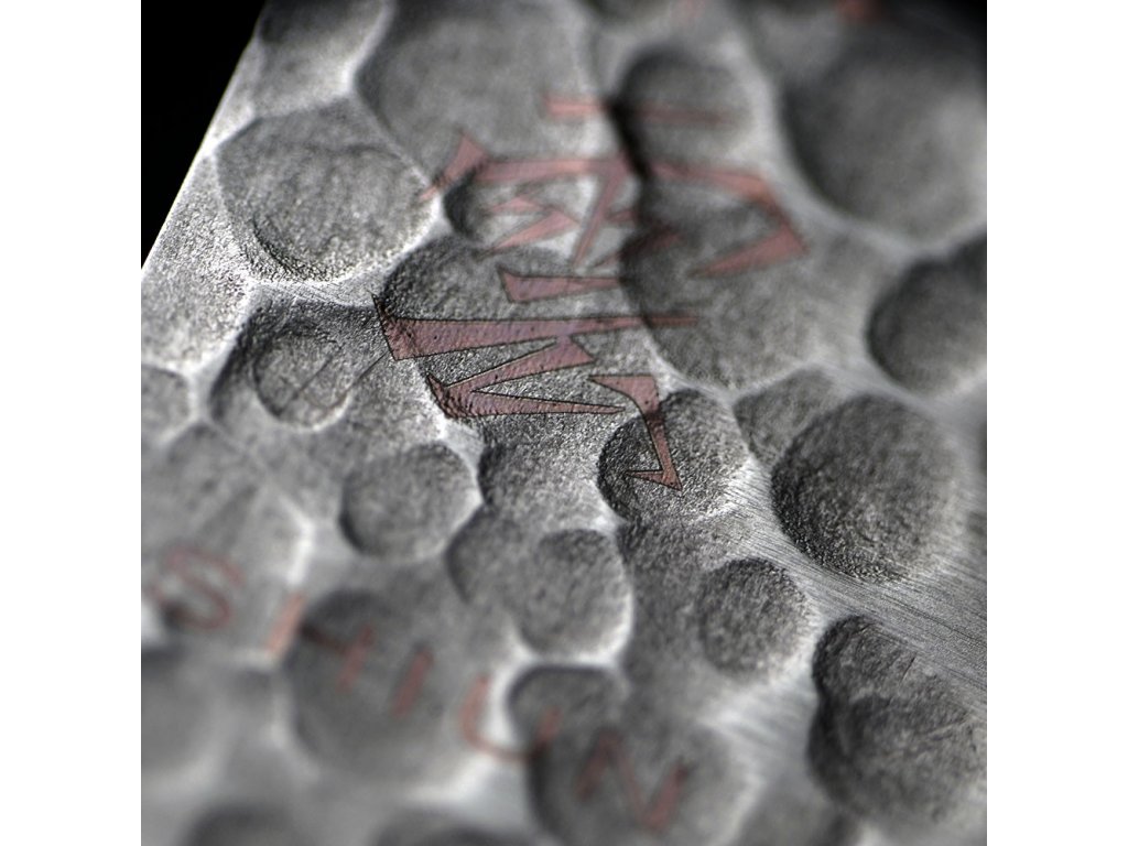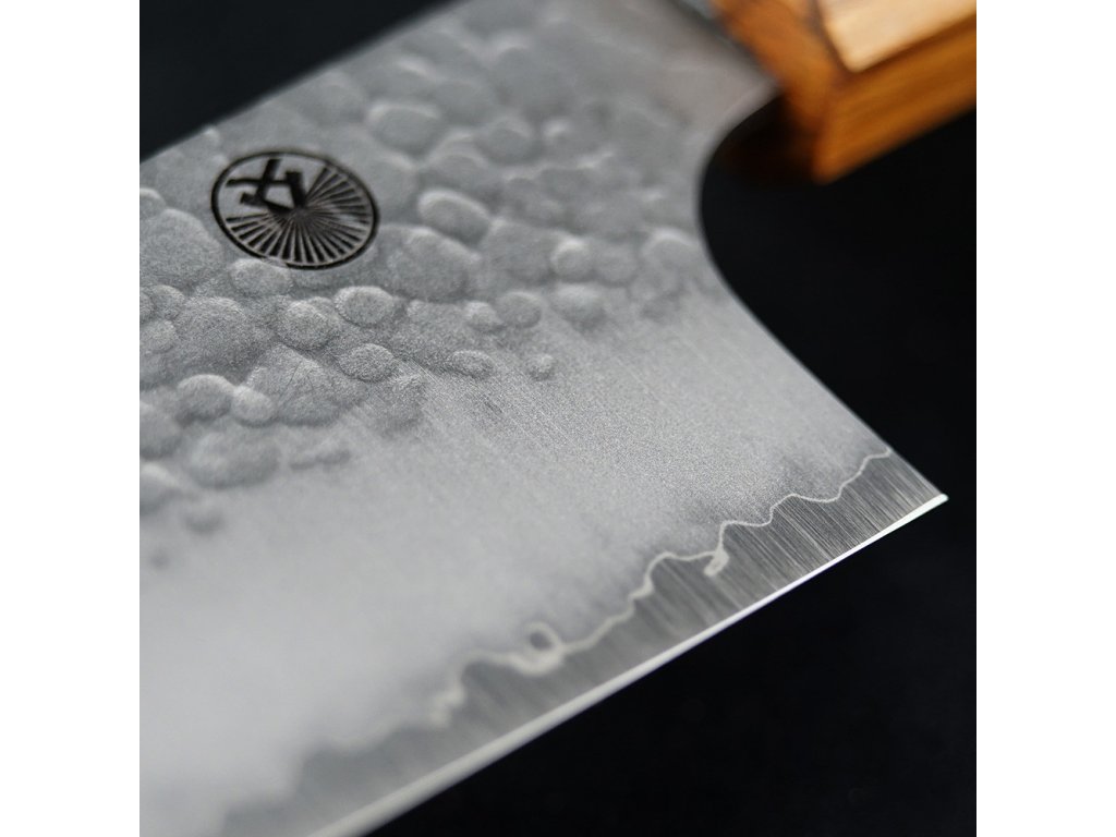 Čepel má strukturovaný vzhled tsuchime, získaný údery kladivem, což nejen dodává krásný vzhled, ale také snižuje ulpívání potravin na ostří.