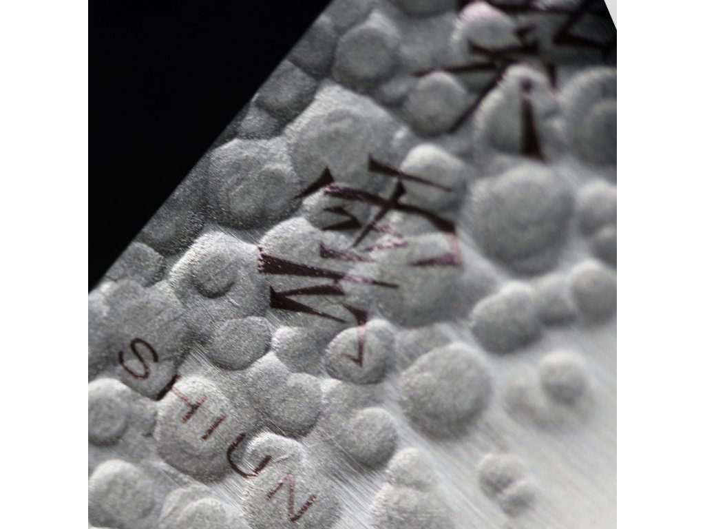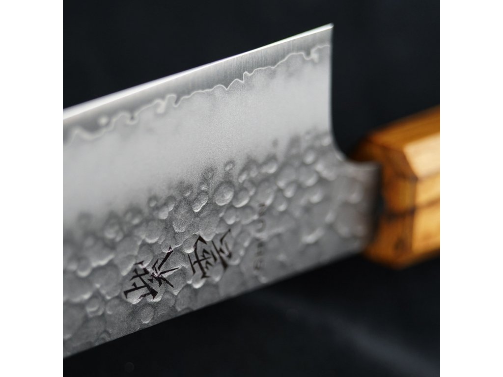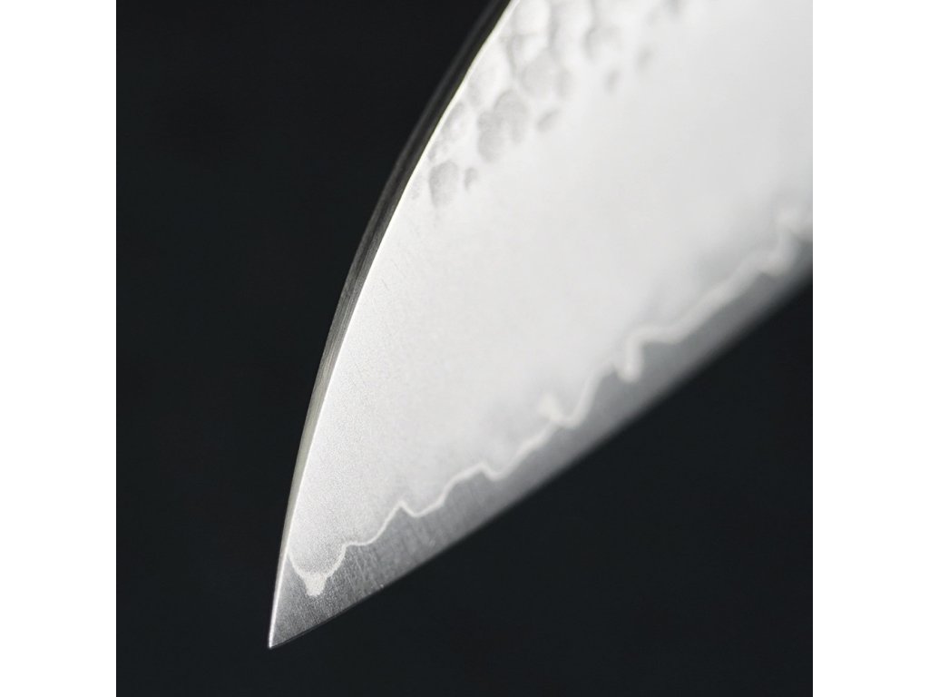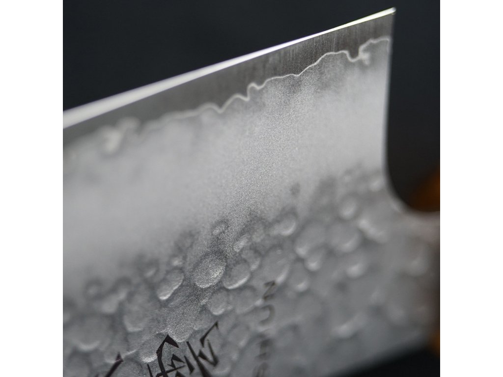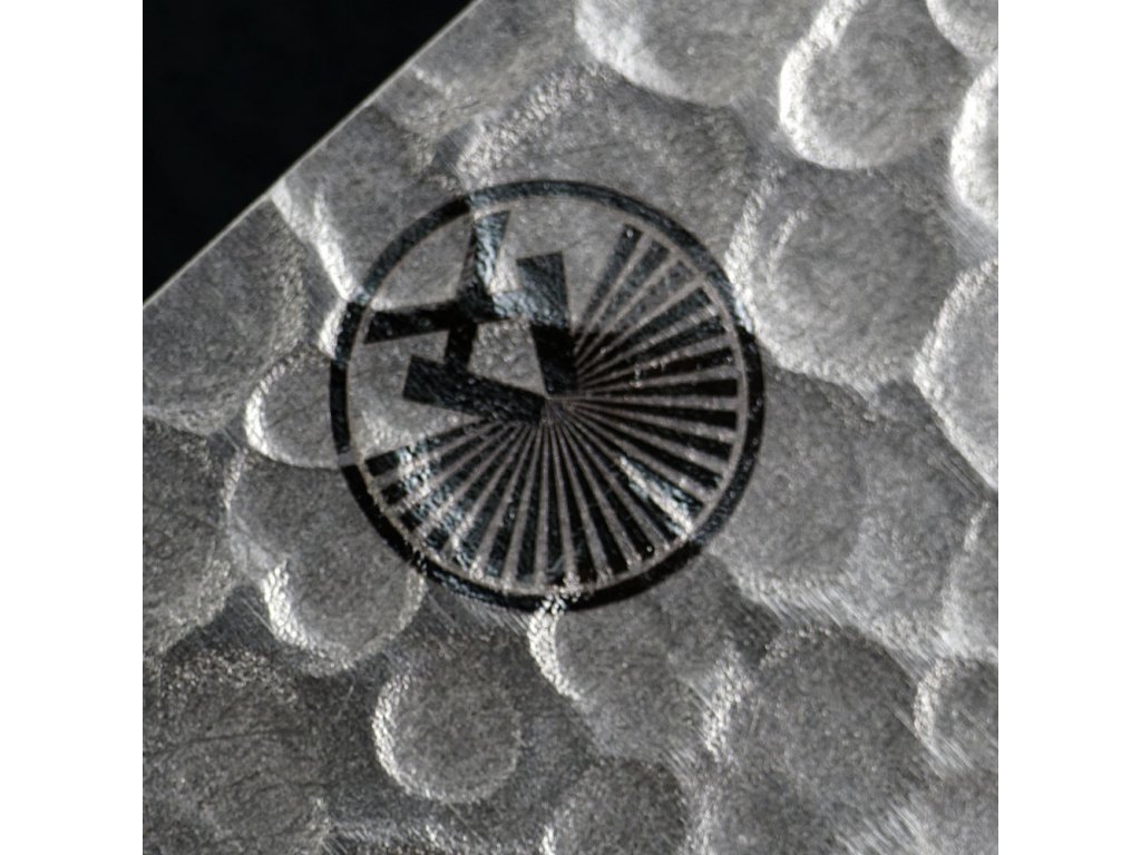Čepel má strukturovaný vzhled tsuchime, získaný údery kladivem, což nejen dodává krásný vzhled, ale také snižuje ulpívání potravin na ostří.