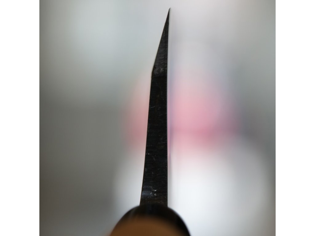 Jednostranné broušení s dutým výbrusem „Ura“ zajišťuje hladké řezy a vysokou přesnost práce. Čepel je vyrobena z velmi čisté uhlíkové oceli Hitachi White Steel #3 (Shirogami #3), kalené na tvrdost 60–61 HRC. Tento druh oceli umožňuje jemné doostření, které ocení zejména profesionálové a zkušení kuchaři, kteří vyžadují špičkový řezný výkon.