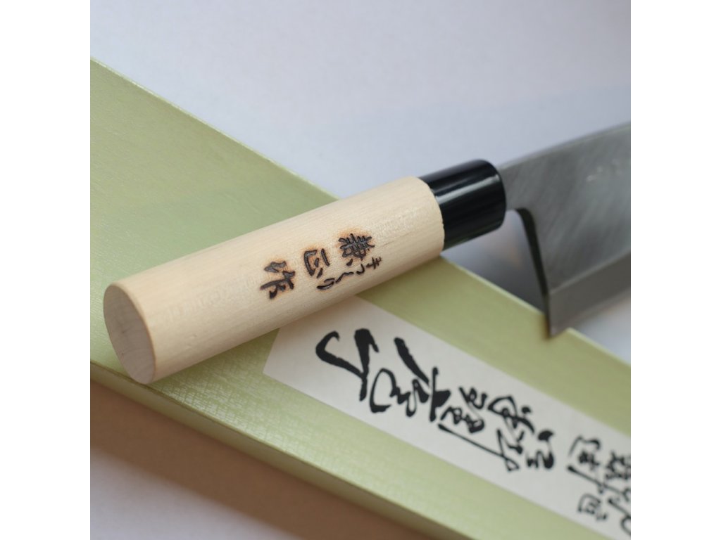 Tradiční rukojeť z přírodního dřeva magnólie s plastovým bolsterem je oblíbená mezi japonskými kuchaři sushi pro své antiseptické vlastnosti. Doporučujeme udržovat rukojeť čistou a suchou, aby si zachovala estetiku i funkčnost. Tento nůž je spolehlivým partnerem pro každodenní profesionální provoz i náročné domácí použití.