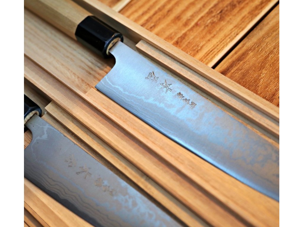 Japonská uhlíková ocel Takefu V special grade 2 není zcela nerezová a proto vyžaduje nadstandardní péči. Nůž je nutné po každém krájení očistit, osušit a potřít olejem. Skvrny a patina na povrchu ostří jsou zcela běžnou součástí těchto velmi ostrých nožů.