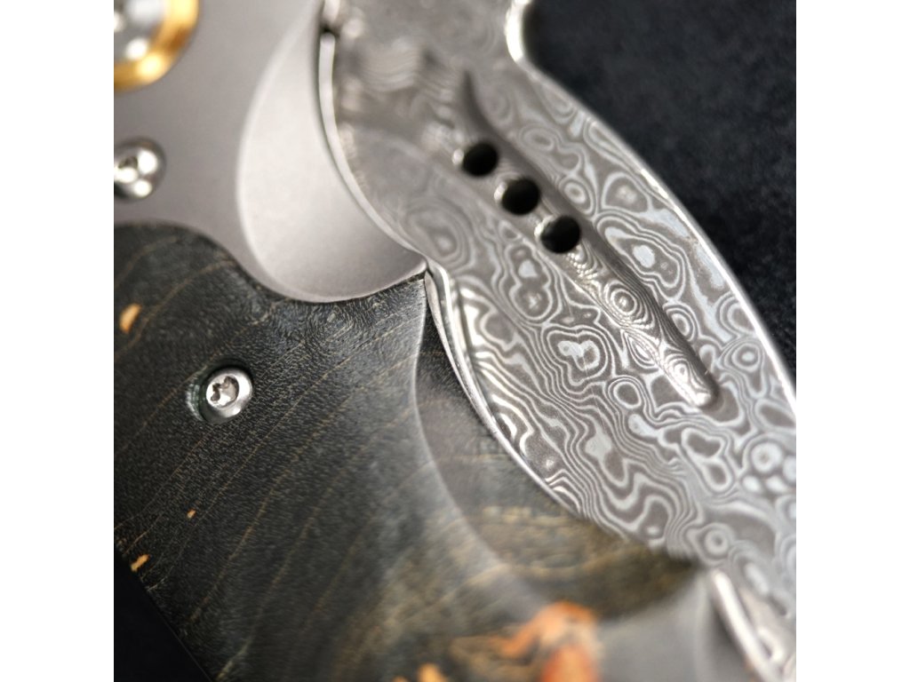 Tento exkluzivní malý zavírací nůž má velmi ostré řezné jádro z japonské oceli VG-10, které je vloženo mezi 66 vrstev nerezových damascénských ocelí SS316 (Damascus steel). To zajišťuje mimořádnou odolnost a houževnatost. Čepel nože prochází kalením ve velmi přesných vakuových pecích (vacuum heat treatment). Každý nůž je ručně broušený a dosahuje mimořádné až extrémní ostrosti při tvrdosti okolo 61 HRC.