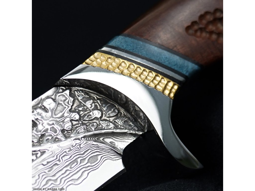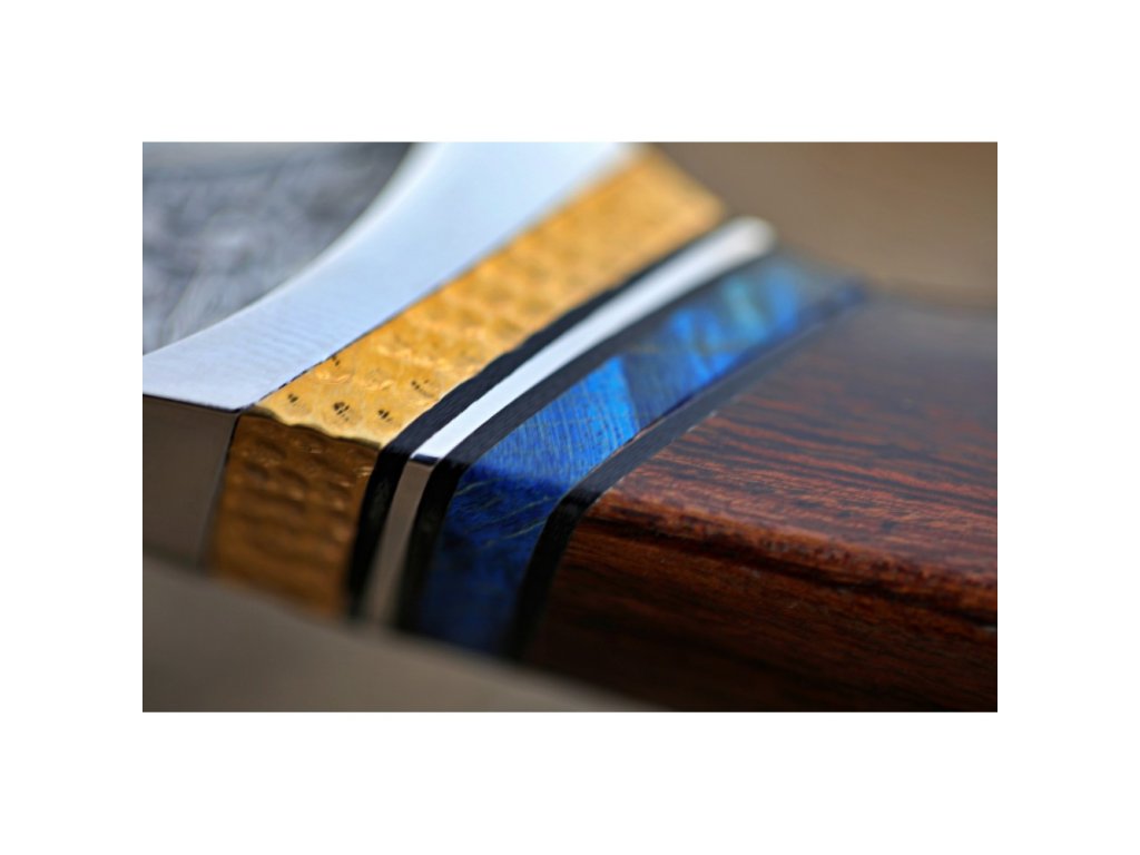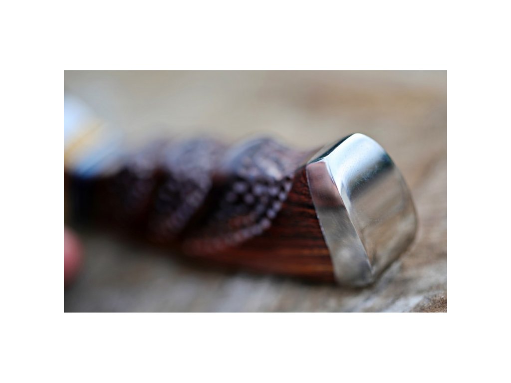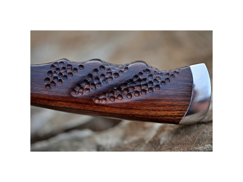 Rukojeť: Rukojeť je vyrobena ze stabilizovaného dřeva "american rosewood", mědi a oceli 4CR13. Tento materiál nejenže zajišťuje pevný úchop a ergonomii, ale také přidává k estetice nože.