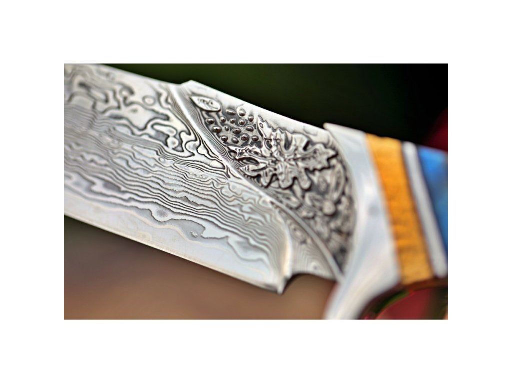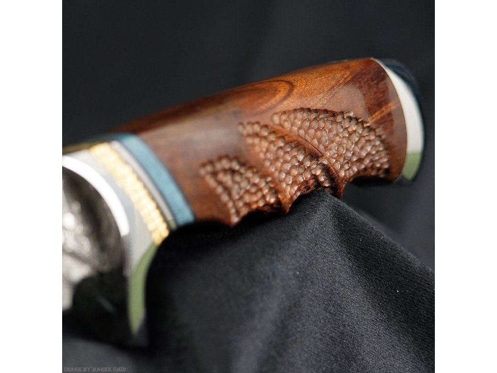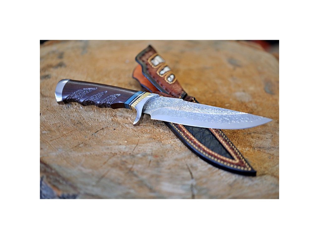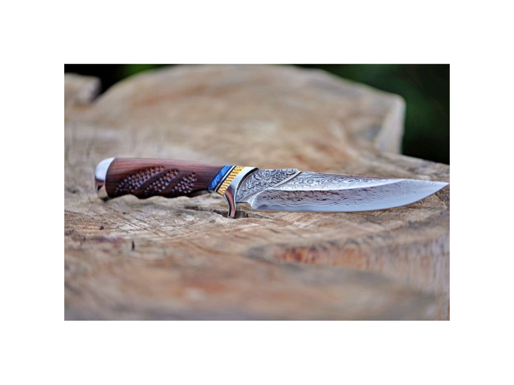 Rukojeť: Rukojeť je vyrobena ze stabilizovaného dřeva "american rosewood", mědi a oceli 4CR13. Tento materiál nejenže zajišťuje pevný úchop a ergonomii, ale také přidává k estetice nože.