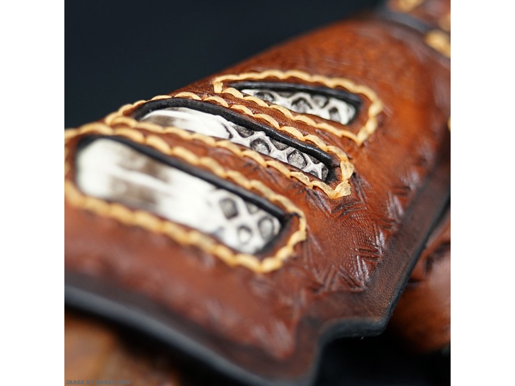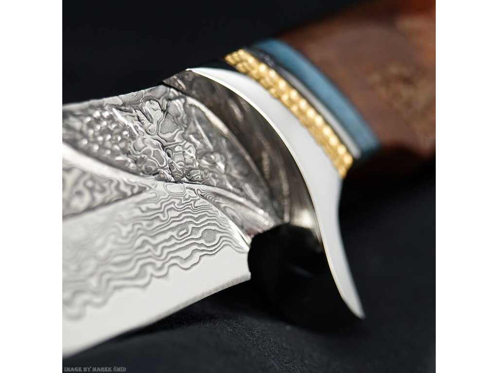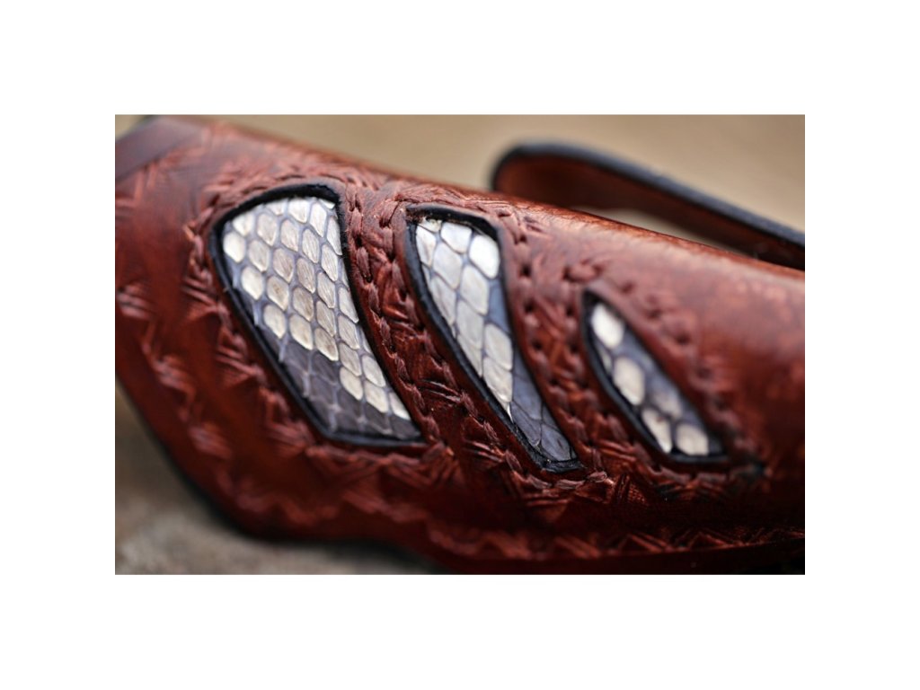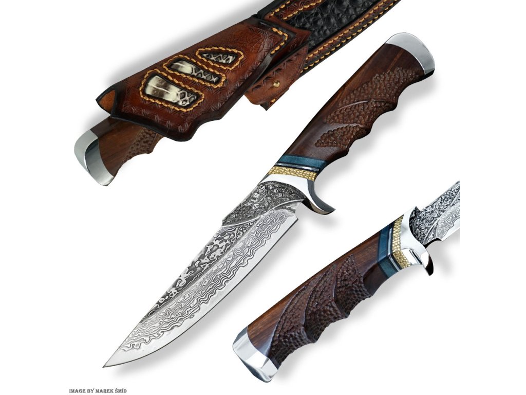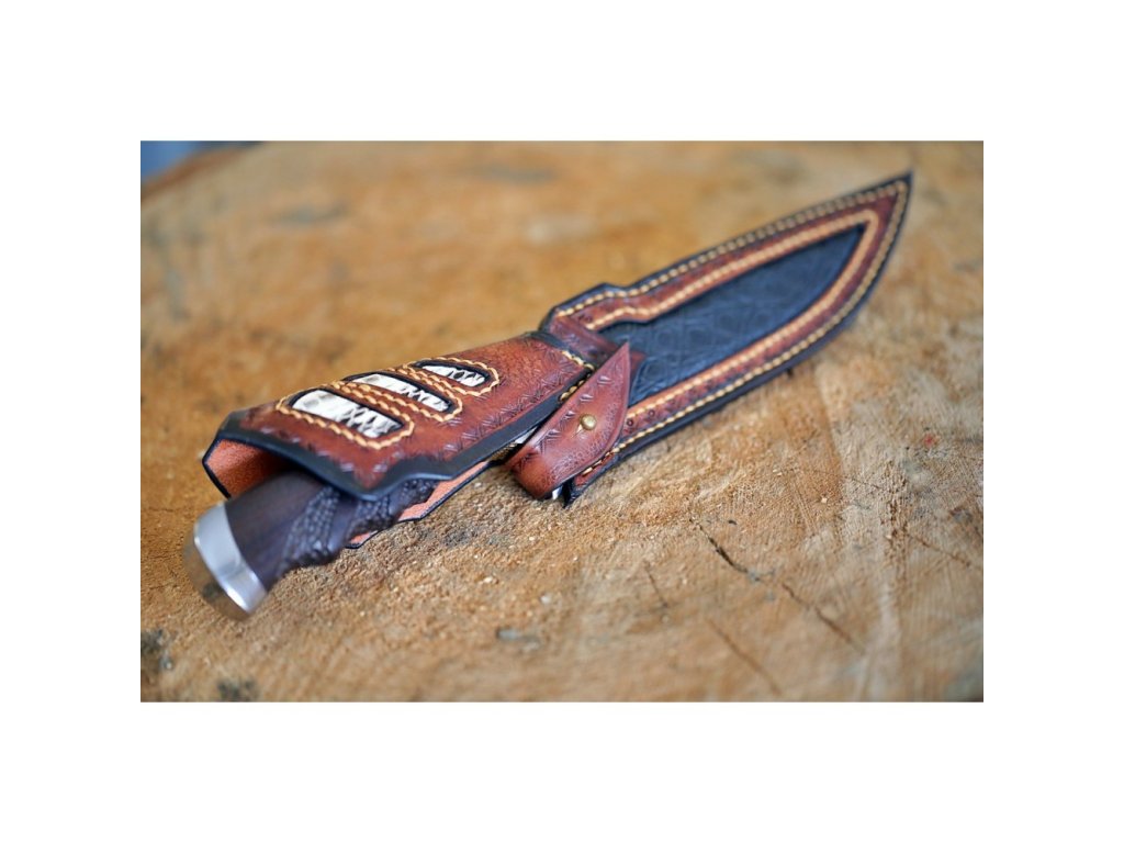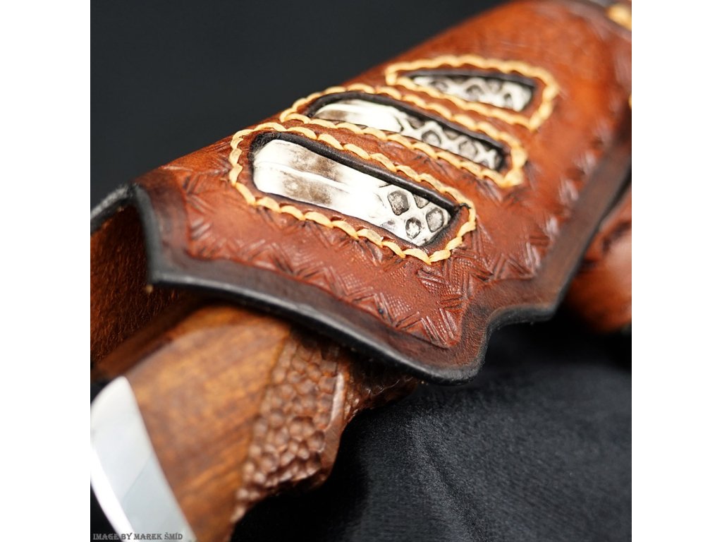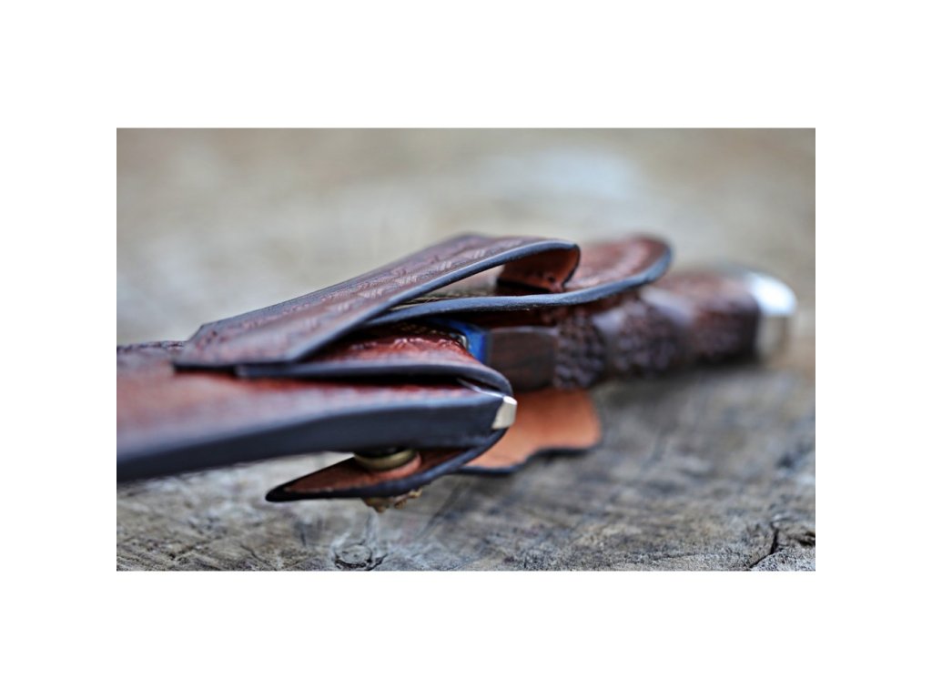 Pouzdro: Luxusní pouzdro je vyrobeno z hovězí a hadí kůže, což zajišťuje nejen ochranu nože, ale také příjemný pocit při nošení.