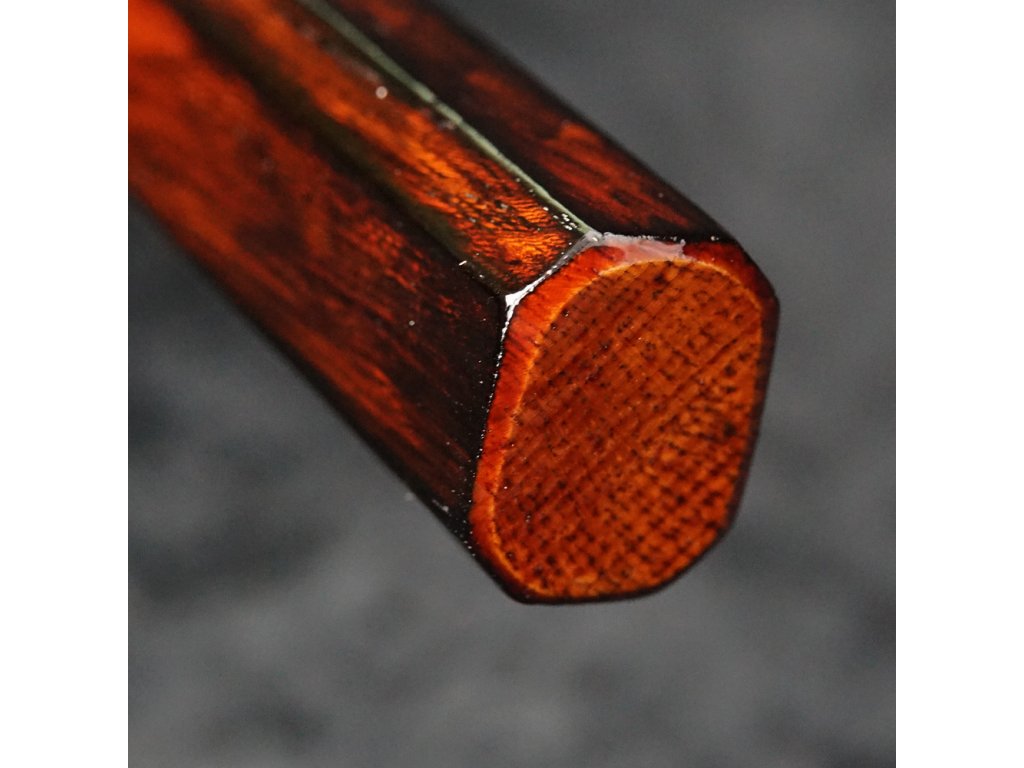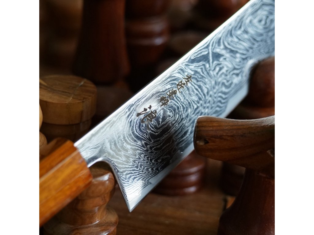 Tento nůž vás zaujme svou čepelí s 32vrstvým damaškovým vzorem, známým jako „vířivý damašek.“ Každý kus je originál, vyrobený s důrazem na detail. Jádro z nerezové oceli Aichi AUS-10 s tvrdostí 62 HRC poskytuje dlouhotrvající ostrost a vysokou odolnost proti korozi. Konstrukce „san-mai clad“ spojuje tvrdé jádro s měkčími vnějšími vrstvami, což přidává na pevnosti i ochraně čepele.