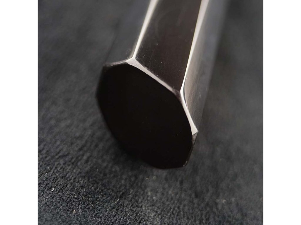 Základem čepele je funkční jádro z vysoce kvalitní nerezové oceli 10Cr15CoMoV s vysokým obsahem uhlíku, které zajišťuje vysokou tvrdost, stabilitu ostří a dlouhodobou řezivost. Jádro je tepelně zpracováno na tvrdost přibližně 60 ±2 HRC, což umožňuje velmi ostré broušení v úhlu 9–12° na stranu při zachování mechanické odolnosti při každodenním použití. Na toto jádro jsou následně řízeně nanášeny vrstvy nerezové oceli a mědi (cuprum), čímž vzniká charakteristická damašková struktura. Na rozdíl od klasického damašku zde vzor nevzniká skládáním a překládáním ocelí, ale precizním vrstvením kovů s rozdílnými fyzikálními a chemickými vlastnostmi. Měď se nepodílí na samotné funkci ostří – její úloha je primárně vizuální a strukturální v povrchových vrstvách, kde vytváří typické zlatavé linie a neopakovatelnou kresbu. Pro zvýraznění struktury damašku nejsou tyto čepele upravovány chemickým leptáním, ale mechanickou metodou pískování. Jemný proud abrazivních částic selektivně odstraňuje měkčí vrstvy materiálu a přirozeně odhaluje vnitřní strukturu oceli. Výsledkem je jemně matný, hedvábně lesklý povrch, který je nejen vizuálně atraktivní, ale také vykazuje vyšší odolnost vůči korozi, opotřebení a mechanickému poškození, a to bez použití chemikálií. Sendvičová konstrukce zároveň přispívá k lepšímu rozložení pnutí v materiálu. Kombinace tvrdého jádra a houževnatějších vnějších vrstev snižuje riziko vzniku mikroskopických trhlin a zvyšuje stabilitu čepele při dynamickém zatížení během krájení.