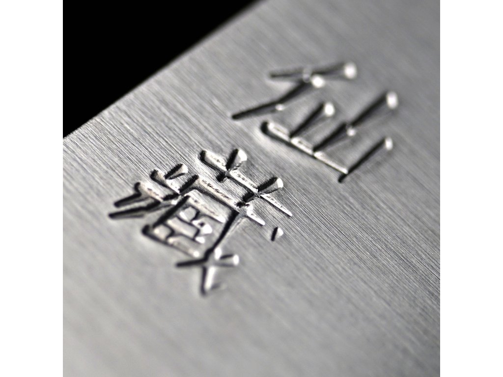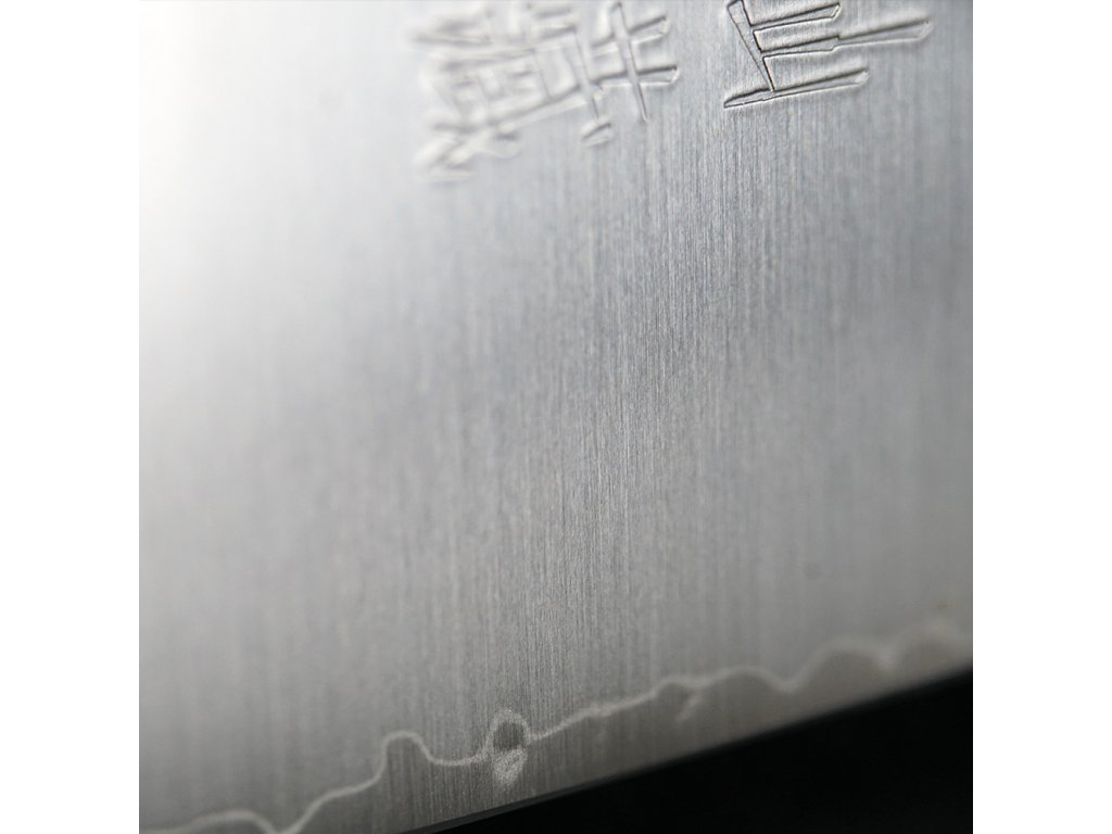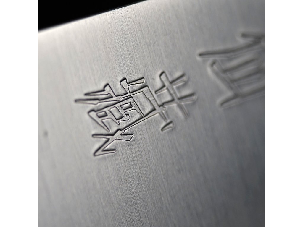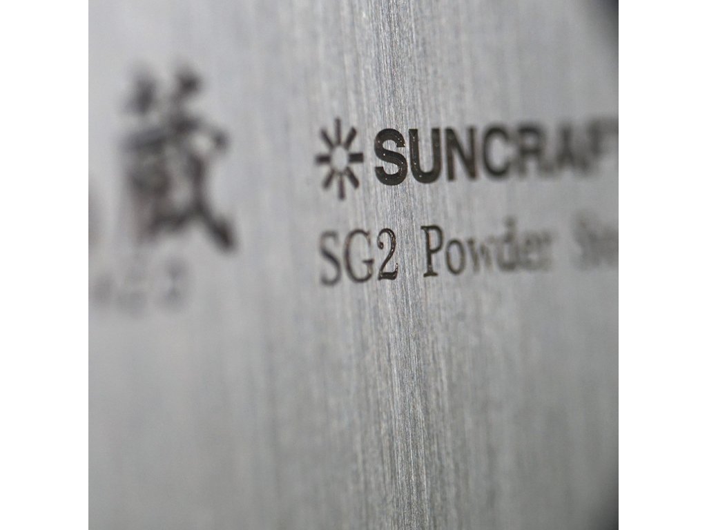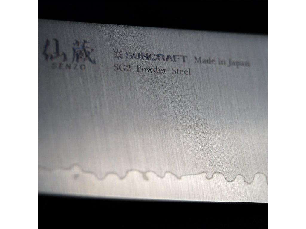 Čepele: Nůž je vyroben z práškové oceli SG2 (Super Gold 2), známé také jako R2 nebo SRS-2. SG2 je vysoce kvalitní japonská ocel, která je ceněná pro svou tvrdost, odolnost proti opotřebení a korozní odolnost. S obsahem přibližně 1,3 % uhlíku a legovaná chromem, molybdenem a vanadem, SG2 poskytuje vynikající výkon s dlouhou životností ostří a snadnou údržbou. Na obou stranách čepele je použita nerezová ocel, která vytváří krásný vlnovitý vzor (hamon), podobný jako u samurajských mečů.