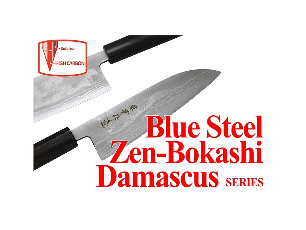 Jádro čepele těchto nožů je kované z vysoce uhlíkové oceli Blue Stee l#2 (Aogami#2). Tato ocel díky tomu že je legovaná chromem a wolframem má vynikající retenci ostří a odolnost. Je velmi oblíbená u japonských výrobců nožů. Tvrdost nože je 61-62HRC. Nádherná damašková čepel „Zen-Bokashi“ má z každé strany 11 vrstev damaškové oceli, spolu s jádrem tedy celkem 23.