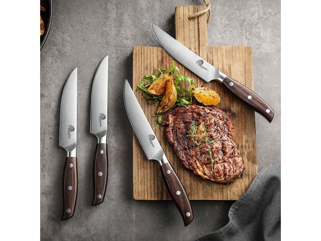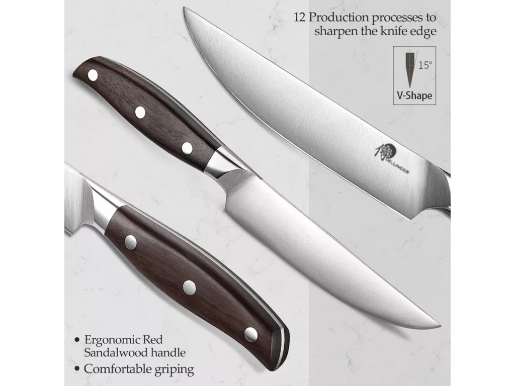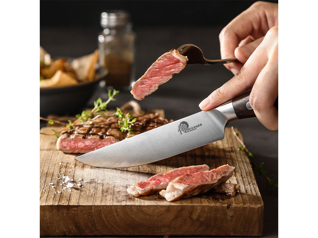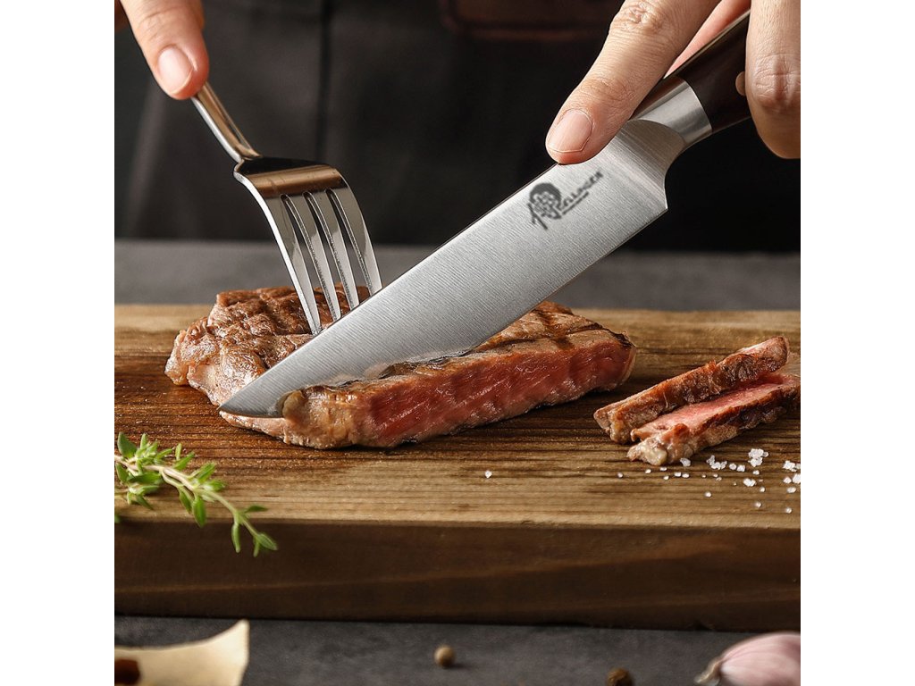 - Ostré a precizní: Tento steakový nůž je vyroben z vysoce kvalitní německé oceli, což zajišťuje jeho vynikající ostrost a dlouhou životnost. S tímto nožem dokonale a bez námahy nakrájíte svůj steak na perfektní plátky.