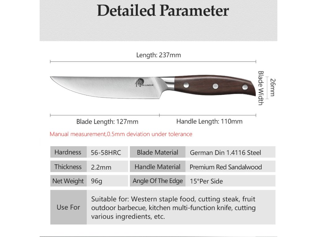 Nůž Steak 5,5" z řady Dellinger Classic Sandal Wood je vysoce kvalitním a velmi ostrým nástrojem s klasickým designem, který je ideální pro krájení a servírování steaku a dalších masových pokrmů.