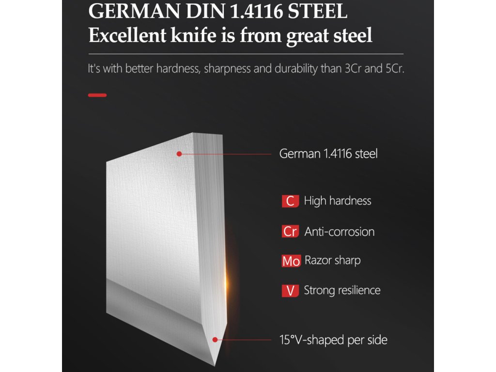 - Materiál čepele: Německá ocel DIN 1.4116