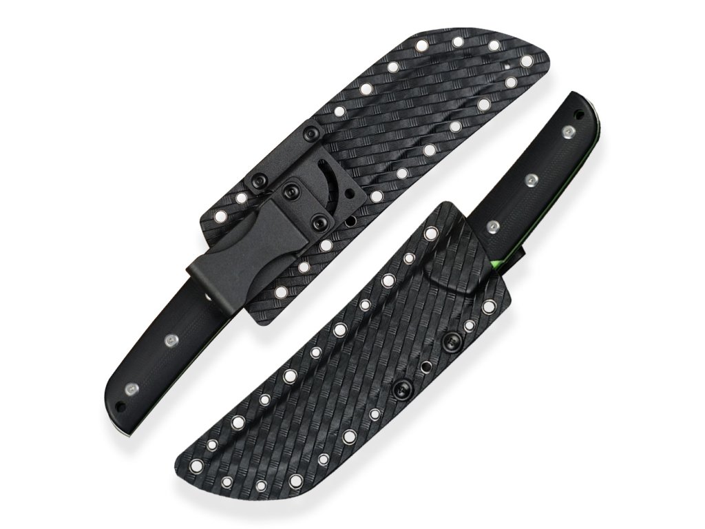 - Materiál Kydex: Nůž je dodáván s pouzdrem vyrobeným z Kydexu, termoplastického polymeru s vysokou pevností a odolností. Pouzdro drží nůž bezpečně na místě a je přizpůsobeno tak, aby nůž nebyl poškozen. Kydex je oblíbený pro svou schopnost udržet pevný tvar a odolat opotřebení i za extrémních podmínek.