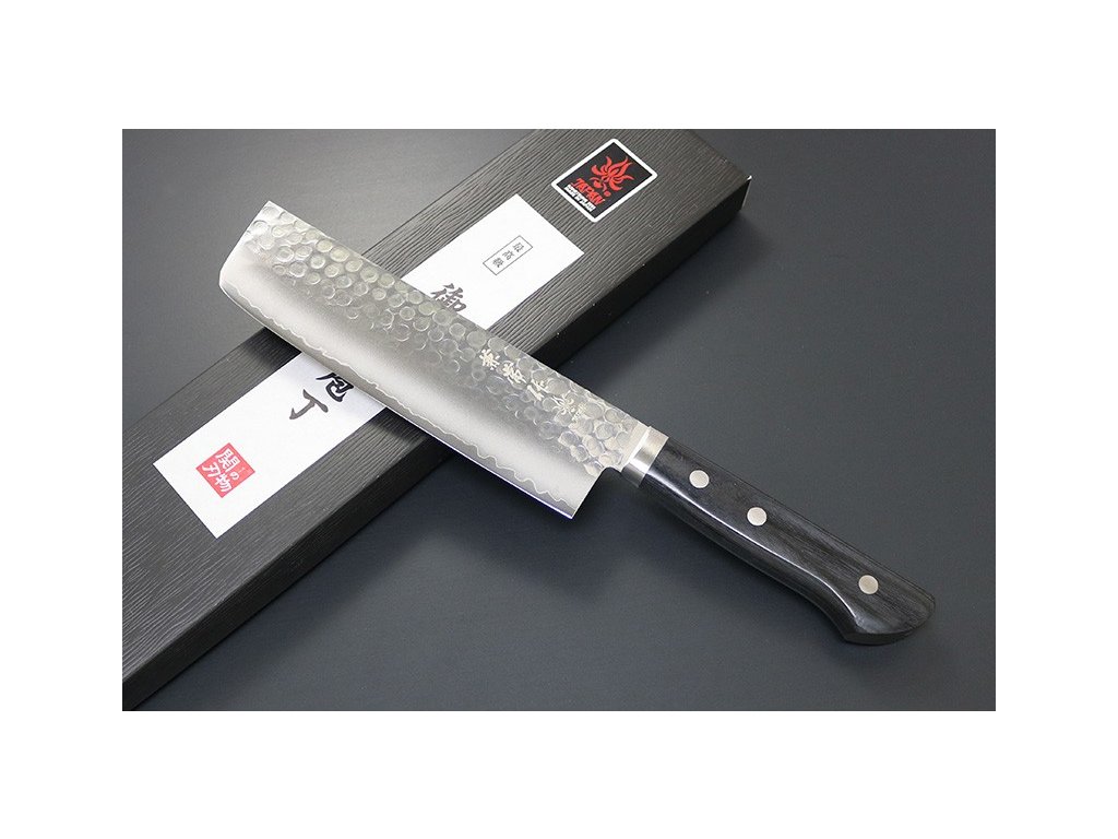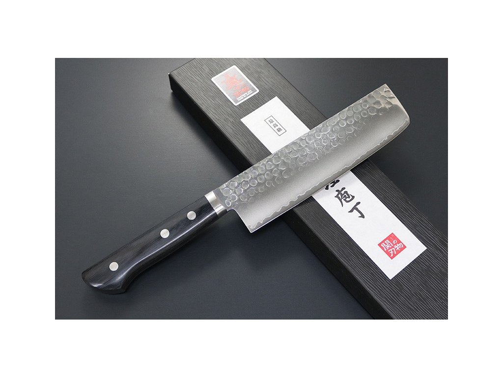 Velmi ostrý japonský nůž NAKIRI/USUBAGATA 165 mm Kanetsune Tsuchime VG-1 series z japonské nerezové oceli VG-1 Stainless steel core /SUS410 Stainless steel (Tsuchime "Mirror" polish). Svým tvarem nůž připomíná sekáček na maso, ale nenechte se mýlit. S čepelí dlouhou 165 mm snadno nakrájíte veškerou zeleninu na drobné kostičky nebo proužky. Výška nože Vám pak umožní nakrájenou surovinu jednoduše nabrat na čepel a přenést do hrnce či pánve. Vysoká čepel a klasická rukojeť z PLYWOODU Vám poskytne tu nejlepší kontrolu při řezání a krájení. Japonská preciznost a nové technologie činí tento nůž z nerezové oceli VG-1 Stainless steel core /SUS410 Stainless steel jedinečným a ideálním jak pro domácí, tak profesionální použití !