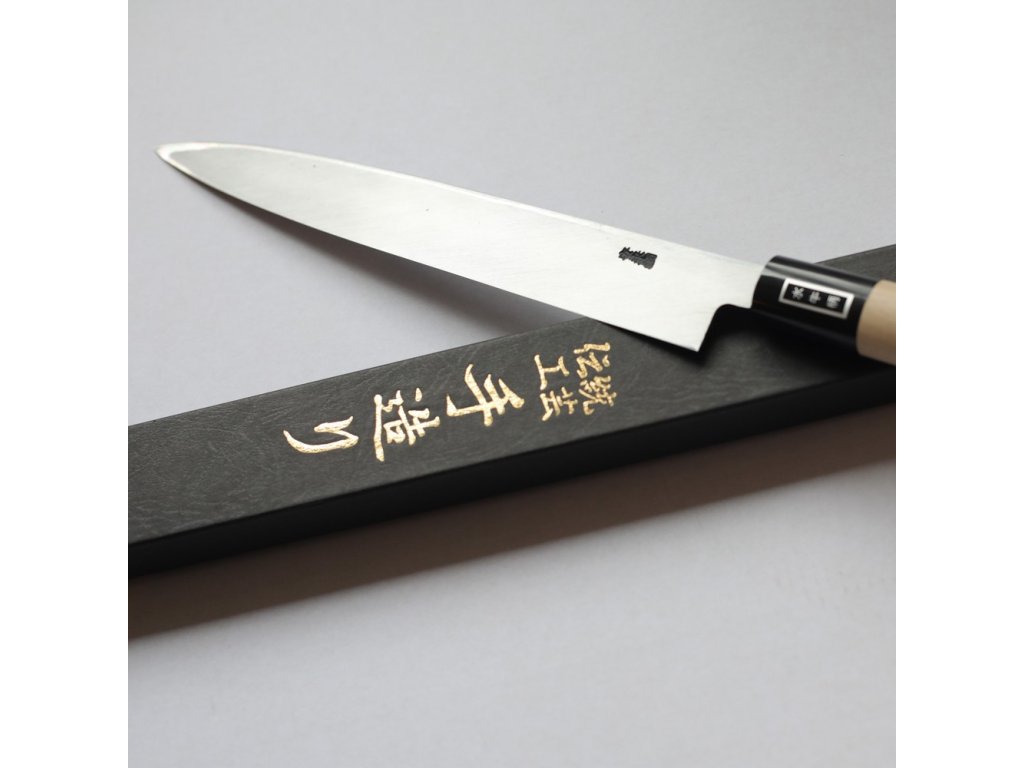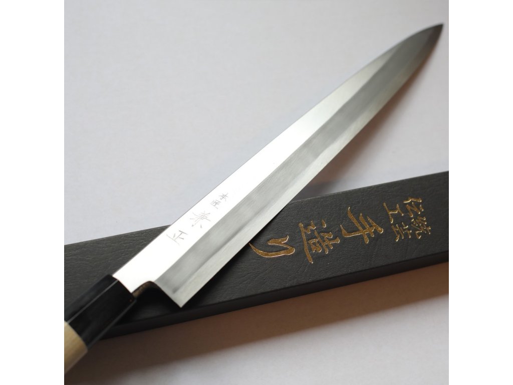 Velmi ostrý japonský nůž Yanagiba/Sashimi 180 mm Kanetsune Honsho Kanemasa G-Series. Je to dlouhý krájecí nůž broušený jen z jedné strany, určený k řezání tenkých plátků ryb pro sushi a sashimi. S tímto nožem snadno nakrájíte velké kusy masa ( pečeně ), ale i tenké plátky zeleniny. Jeho překrásná elegantní tenká čepel je schopna řezat přísady v dlouhých nepřerušovaných řezech a tím zachovat jejich celistvost a svěžest. Yanagiba je jedním z nejdůležitějších tradičních japonských nožů a je součástí repertoáru mnoha kuchařů. Dokonce i nejjednodušší úkoly s tímto krásným a funkčním nožem jsou povýšeny na mimořádný zážitek. Ostrá čepel a rukojeť ve tvaru písmene D ze dřeva magnolie Vám poskytne tu nejlepší kontrolu při řezání a krájení.