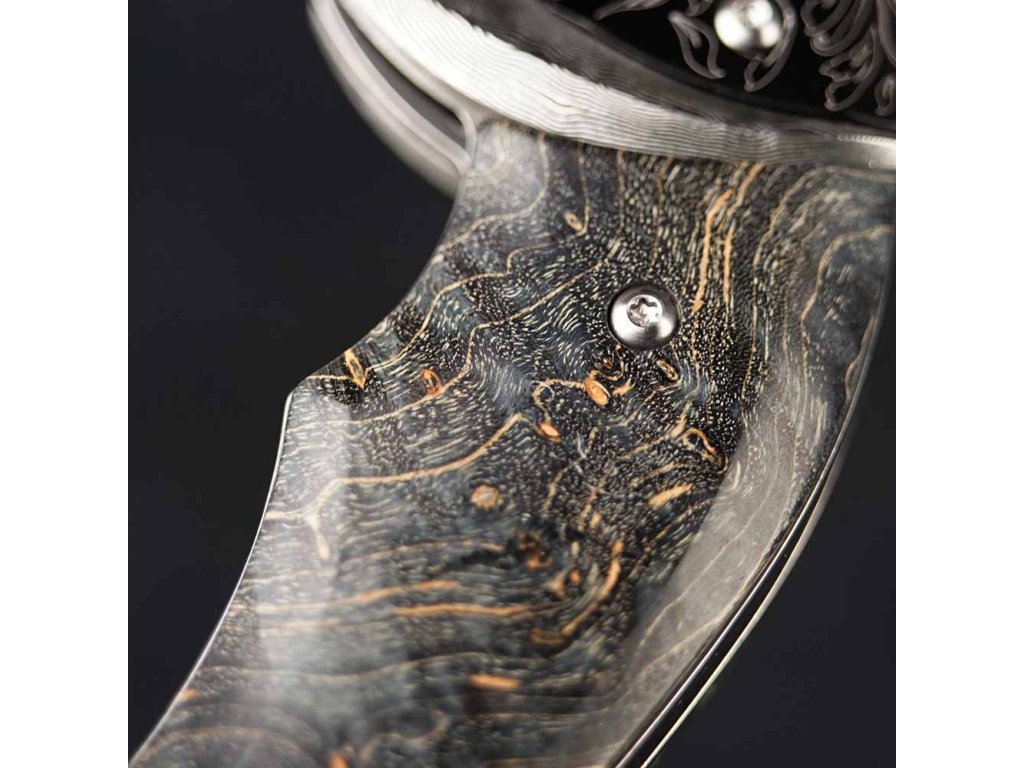 Rukojeť nože je z exotického dřeva Sapele-Wood, které je příjemné na dotek a zároveň poskytuje luxusní vzhled. Kovové detaily, masivní bolster pro pevné a jisté uchopení a stylový přívěsek ve tvaru lebky dodávají noži jedinečný charakter.