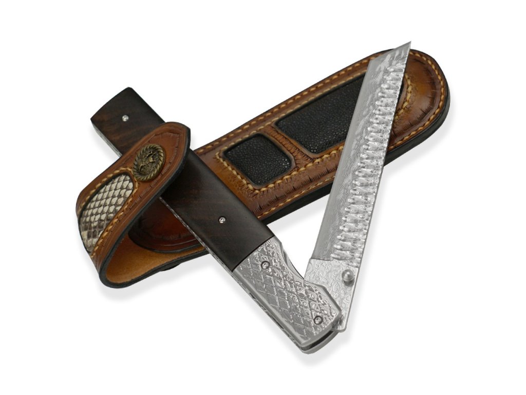 - Pouzdro: Luxusní kožené pouzdro z kvalitních materiálů, které zajišťuje bezpečné uložení nože.