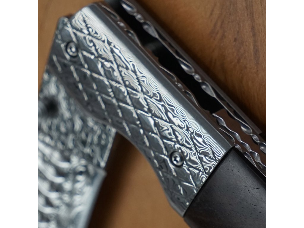 - Materiál čepele: Jádro z damaškové oceli VG10, vložené mezi 66 vrstev nerezových damascénských ocelí SS316