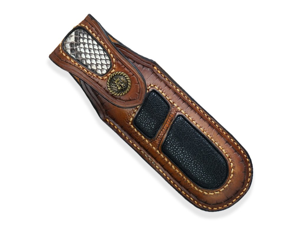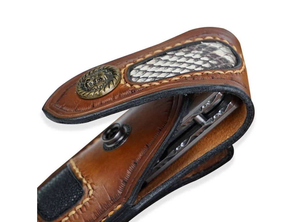 - Pouzdro: Kožené pouzdro z hovězinové třísločiněné usně, kombinované s hadí kůží a kůží perlové ryby, ručně šité